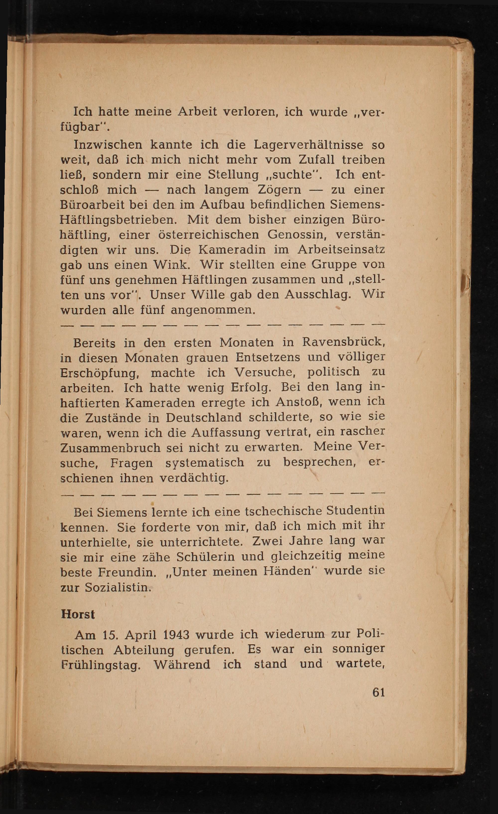Bei Siemens lernte ich eine tschechische Studentin kennen. Sie forderte von mir, daß ich mich mit ihr unterhielte, sie unterrichtete. Zwei Jahre lang war sie mir eine zähe Schülerin und gleichzeitig meine beste Freundin. ,, Unter meinen Händen" wurde sie zur Sozialistin.