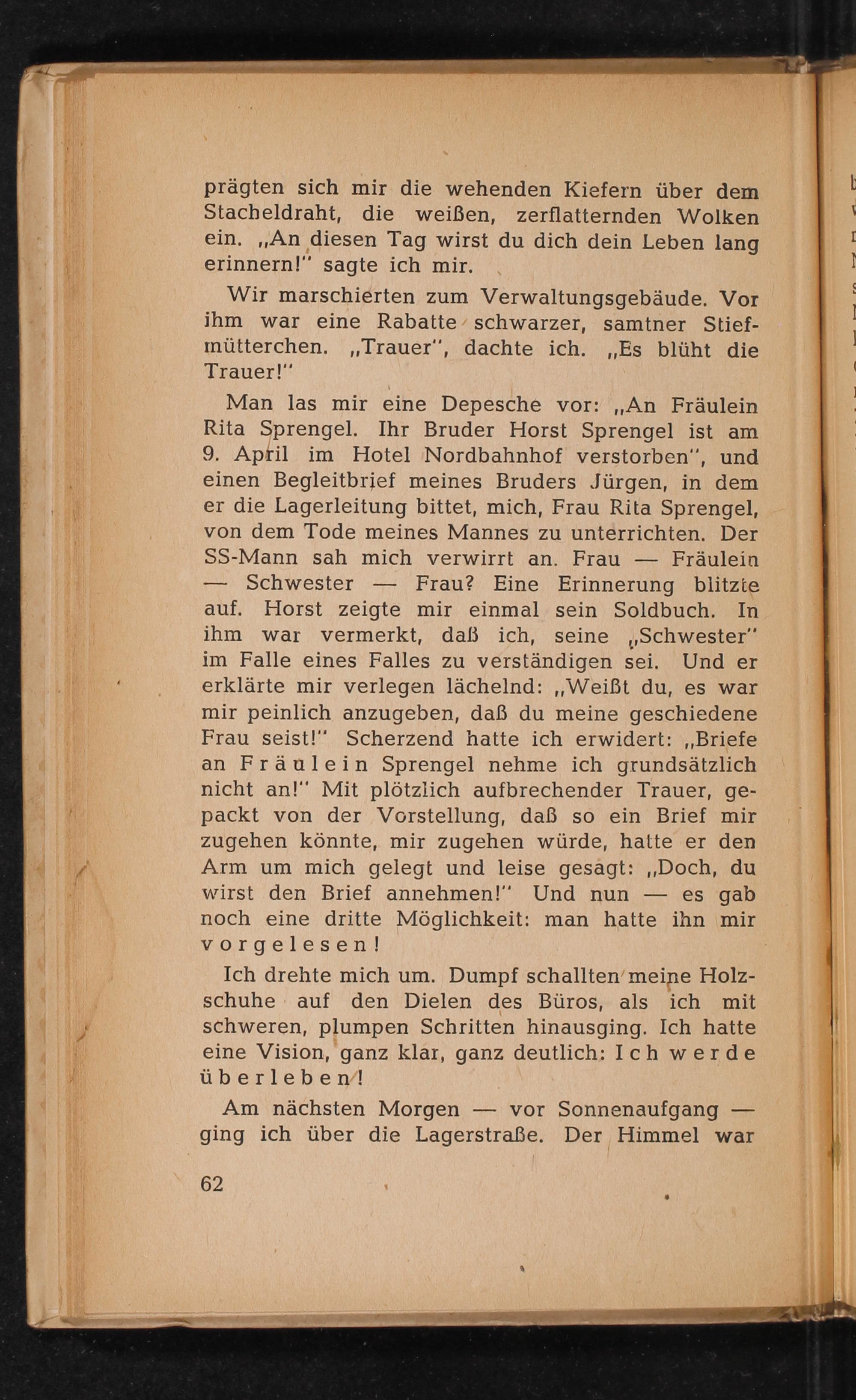 Man las mir eine Depesche vor: ,, An Fräulein Rita Sprengel. Ihr Bruder Horst Sprengel ist am 9. April im Hotel Nordbahnhof verstorben", und einen Begleitbrief meines Bruders Jürgen, in dem er die Lagerleitung bittet, mich, Frau Rita Sprengel, von dem Tode meines Mannes zu unterrichten. Der SS- Mann sah mich verwirrt an. Frau Fräulein Frau? Eine Erinnerung blitzte auf. Horst zeigte mir einmal sein Soldbuch. In ihm war vermerkt, daß ich, seine Schwester" im Falle eines Falles zu verständigen sei. Und er erklärte mir verlegen lächelnd: ,, Weißt du, es war mir peinlich anzugeben, daß du meine geschiedene Frau seist!" Scherzend hatte ich erwidert: ,, Briefe an Fräulein Sprengel nehme ich grundsätzlich nicht an!" Mit plötzlich aufbrechender Trauer, gepackt von der Vorstellung, daß so ein Brief mir zugehen könnte, mir zugehen würde, hatte er den Arm um mich gelegt und leise gesagt: ,, Doch, du wirst den Brief annehmen!" Und nun es gab noch eine dritte Möglichkeit: man hatte ihn mir vorgelesen!