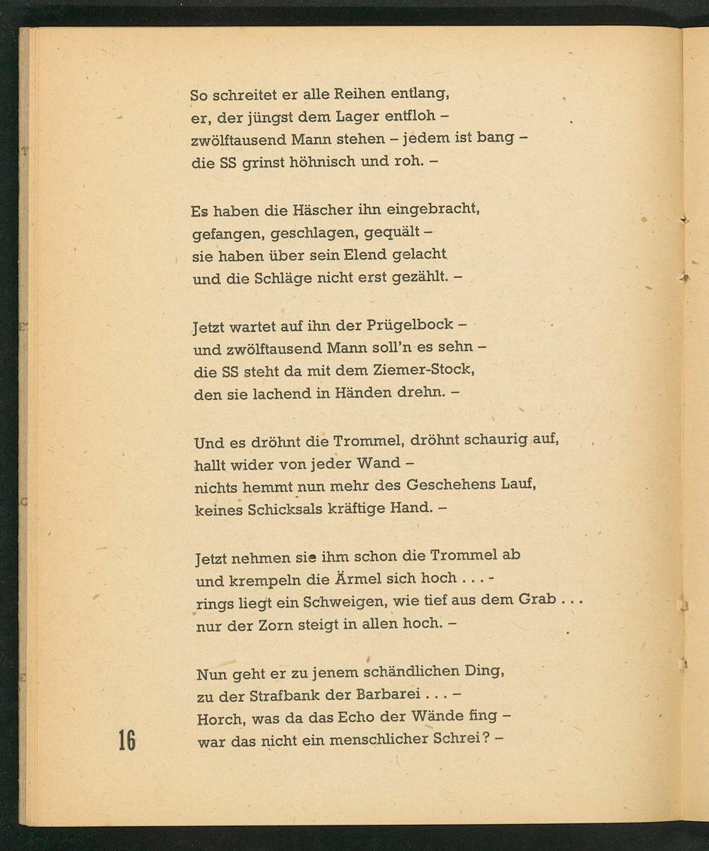 Jetzt wartet auf ihn der Prügelbock- und zwölftausend Mann soll’n es sehn— die SS steht da mit dem Ziemer-Stock, den sie lachend in Händen drehn.—