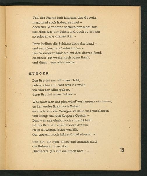Und die, die ganz elend und hungrig sind, die flehen in ihrer Not: „Kamerad, gib mir ein Stück Brot!‘- 19