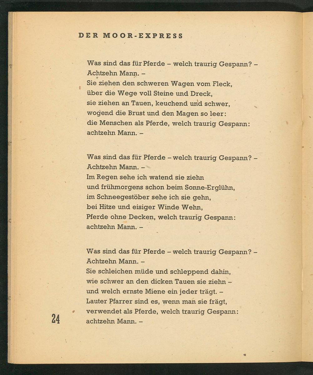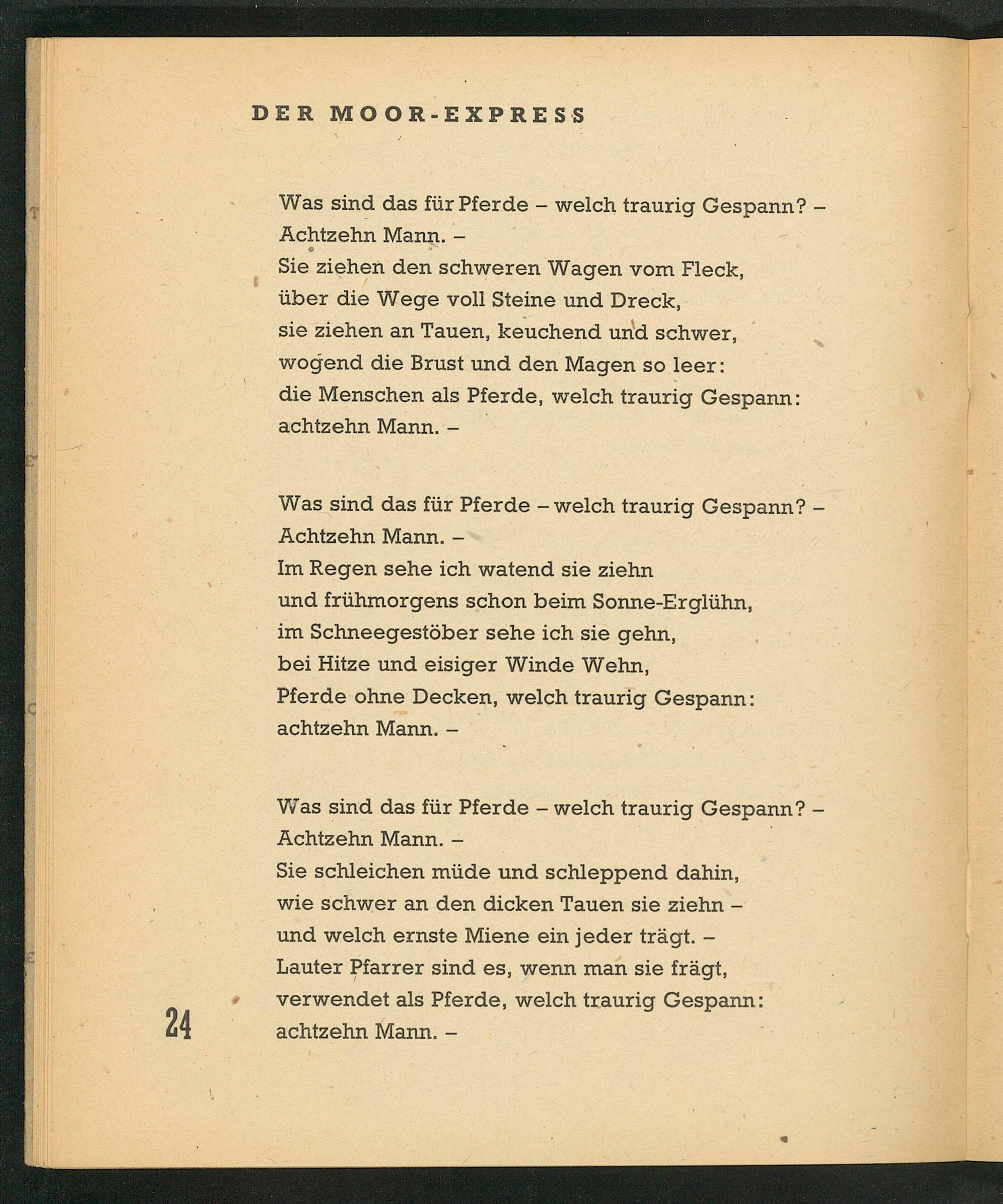 Sie ziehen den schweren Wagen vom Fleck,| über die Wege voll Steine und Dreck, sie ziehen an Tauen, keuchend und schwer,