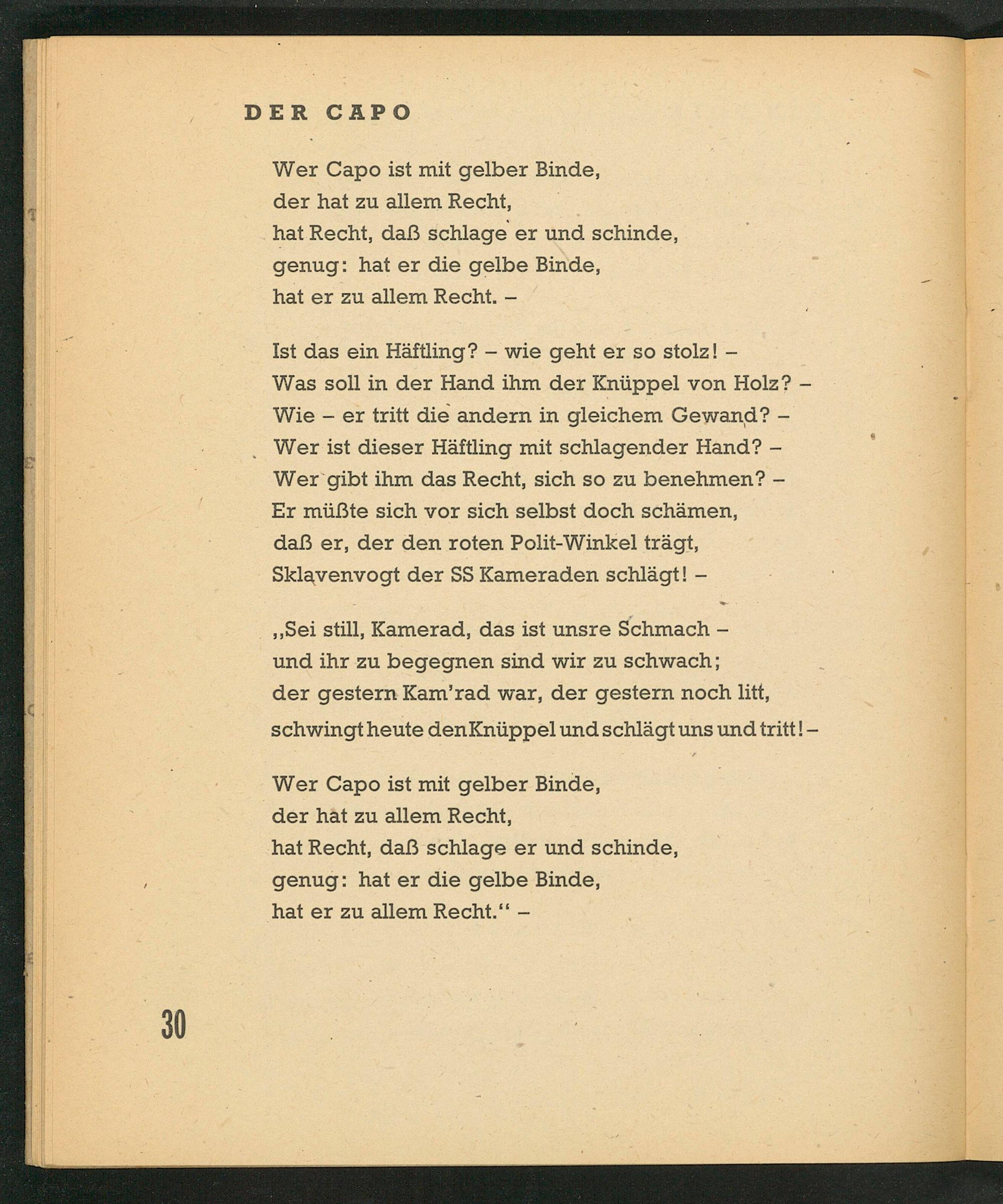 Wie er tritt die andern in gleichem Gewand?- Wer ist dieser Häftling mit schlagender Hand?- Wer gibt ihm das Recht, sich so zu benehmen?- Er müßte sich vor sich selbst doch schämen, daß er, der den roten Polit- Winkel trägt, Sklavenvogt der SS Kameraden schlägt!-