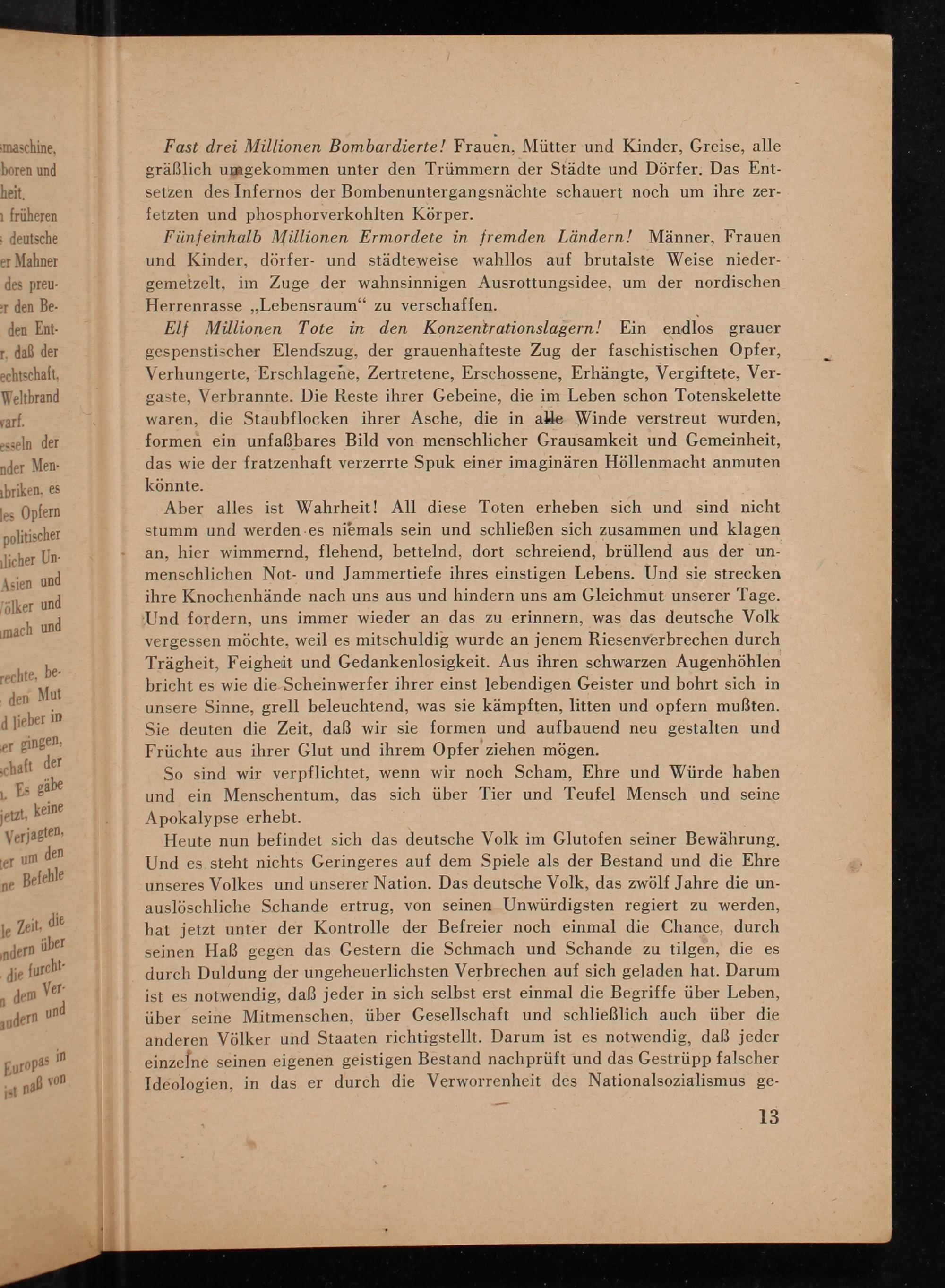 Heute nun befindet sich das deutsche Volk im Glutofen seiner Bewährung. Und es steht nichts Geringeres auf dem Spiele als der Bestand und die Ehre unseres Volkes und unserer Nation. Das deutsche Volk, das zwölf Jahre die unauslöschliche Schande ertrug, von seinen Unwürdigsten regiert zu werden, hat jetzt unter der Kontrolle der Befreier noch einmal die Chance, durch seinen Haß gegen das Gestern die Schmach und Schande zu tilgen, die es durch Duldung der ungeheuerlichsten Verbrechen auf sich geladen hat. Darum ist es notwendig, daß jeder in sich selbst erst einmal die Begriffe über Leben, über seine Mitmenschen, über Gesellschaft und schließlich auch über die anderen Völker und Staaten richtigstellt. Darum ist es notwendig, daß jeder einzelne seinen eigenen geistigen Bestand nachprüft und das Gestrüpp falscher Ideologien, in das er durch die Verworrenheit des Nationalsozialismus ge