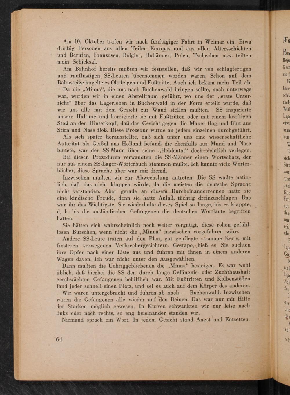 Bei diesen Prozeduren verwandten die SS -Männer einen Wortschatz, der nur aus einem SS-Lager-Wörterbuch stammen mußte. Ich kannte viele Wörter- bücher, diese Sprache aber war mir fremd.