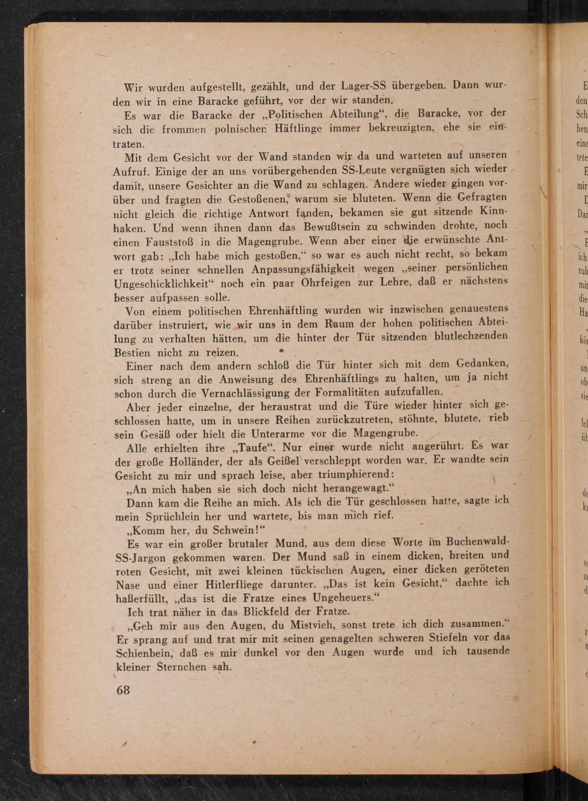 Es war ein großer brutaler Mund, aus dem diese Worte im Buchenwald - SS -Jargon gekommen waren. Der Mund saß in einem dicken, breiten und roten Gesicht, mit zwei kleinen tückischen Augen, einer dicken geröteten Nase und einer Hitlerfliege darunter.„Das ist kein Gesicht,“ dachte ich haßerfüllt,„das ist die Fratze eines Ungeheuers.“