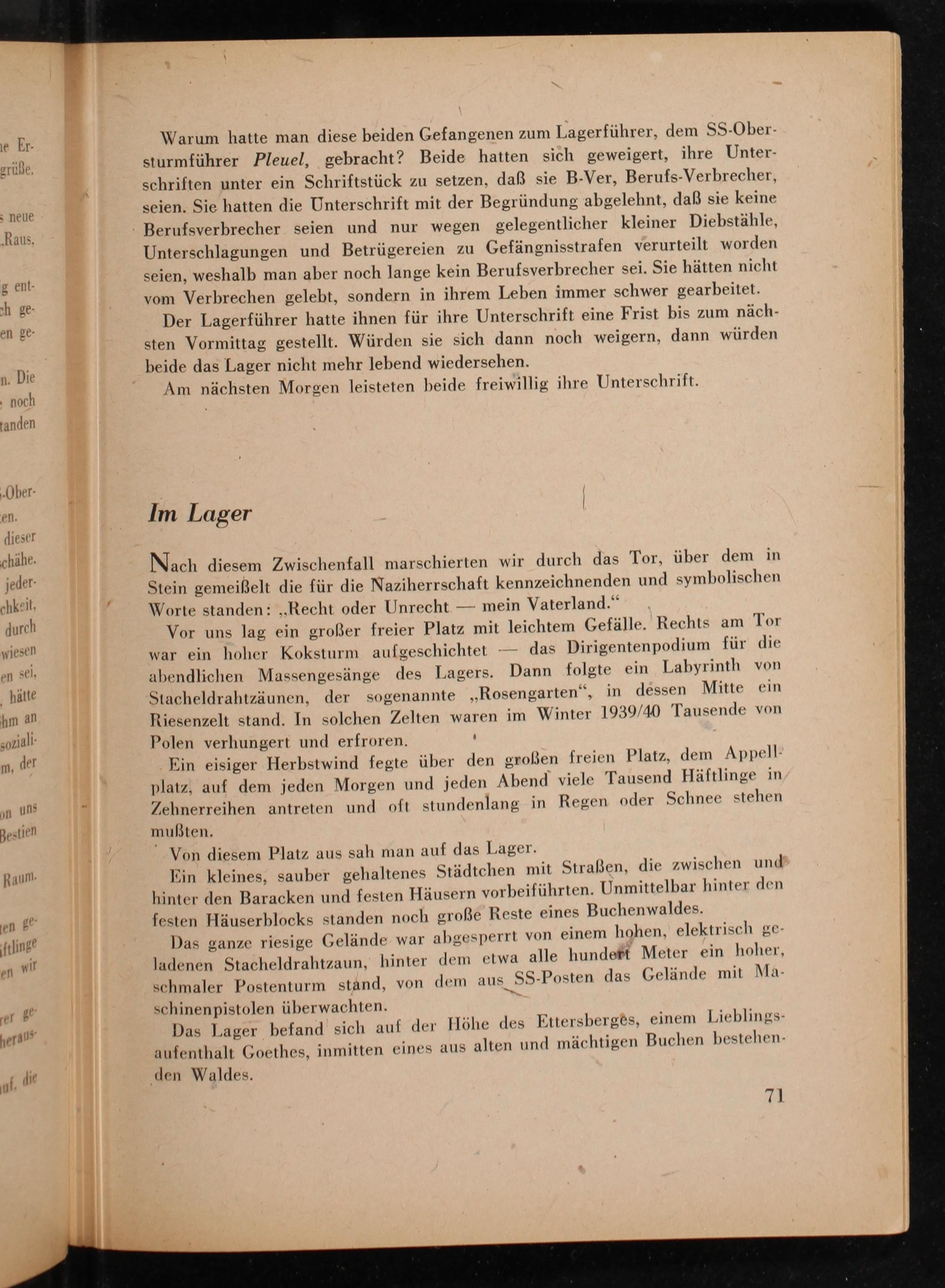Warum hatte man diese beiden Gefangenen zum Lagerführer, dem SS- Obersturmführer Pleuel, gebracht? Beide hatten sich geweigert, ihre Unterschriften unter ein Schriftstück zu setzen, daß sie B- Ver, Berufs- Verbrecher, seien. Sie hatten die Unterschrift mit der Begründung abgelehnt, daß sie keine Berufsverbrecher seien und nur wegen gelegentlicher kleiner Diebstähle, Unterschlagungen und Betrügereien zu Gefängnisstrafen verurteilt worden seien, weshalb man aber noch lange kein Berufsverbrecher sei. Sie hätten nicht vom Verbrechen gelebt, sondern in ihrem Leben immer schwer gearbeitet. Der Lagerführer hatte ihnen für ihre Unterschrift eine Frist bis zum nächsten Vormittag gestellt. Würden sie sich dann noch weigern, dann würden beide das Lager nicht mehr lebend wiedersehen.