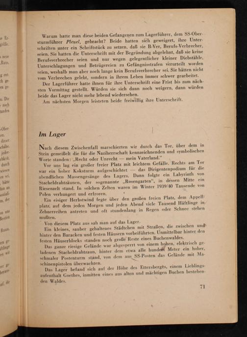 Nach diesem Zwischenfall marschierten wir durch das Tor, über dem in Stein gemeißelt die für die Naziherrschaft kennzeichnenden und symbolischen Worte standen: ,, Recht oder Unrecht- mein Vaterland."