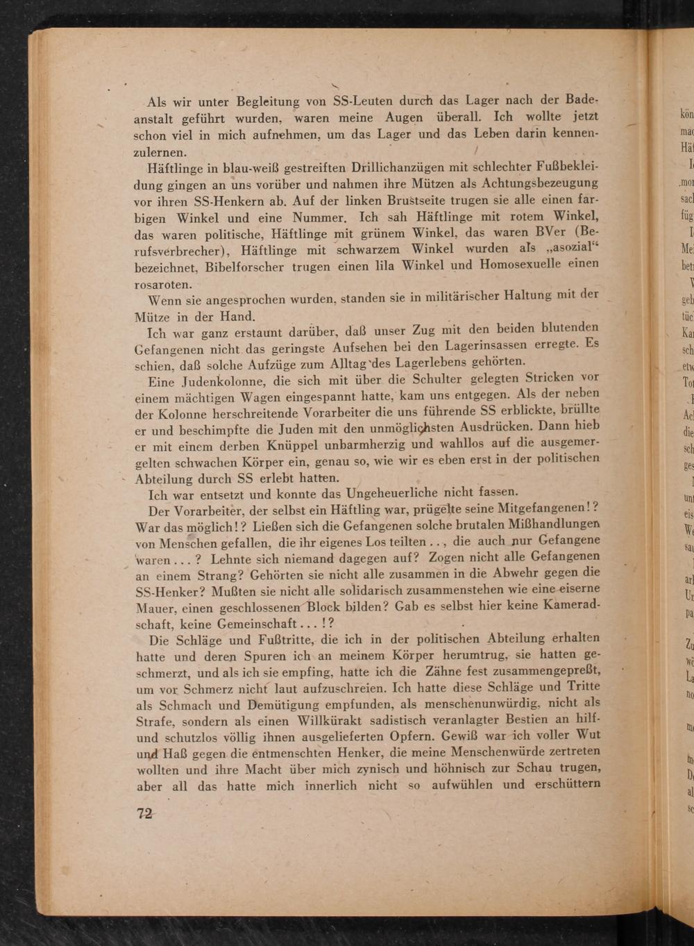 Häftlinge in blau-weiß gestreiften Drillichanzügen mit schlechter Fußbeklei- dung gingen an uns vorüber und nahmen ihre Mützen als Achtungsbezeugung vor ihren SS -Henkern ab. Auf der linken Brustseite trugen sie alle einen far- bigen Winkel und eine Nummer. Ich sah Häftlinge mit rotem Winkel, das waren politische, Häftlinge mit grünem Winkel, das waren BVer(Be- rufsverbrecher), Häftlinge mit‘schwarzem Winkel wurden als„asozial“ bezeichnet, Bibelforscher trugen einen lila Winkel und Homosexuelle einen rosaroten.