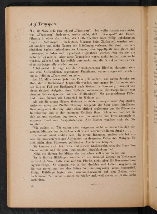 Nein, die Herzen der Mütter des deutschen Volkes waren bei uns! Zu je fünfzig Häftlingen wurden wir am Bahnhof Weimar in Viehwagen verfrachtet. Streh hatte man nur für Pferde, nicht aber für Konzentrationslagerhäftlinge. So standen wir in den dunklen und kalten Waggons, in die von unten und von den Seiten her ein eisigkalter Wind hineinstieẞ. Einige Häftlinge legten sich zusammengekauert auf den Boden, aber nach kurzer Zeit schon standen sie wieder auf, weil sie es vor Kälte nicht aushielten.