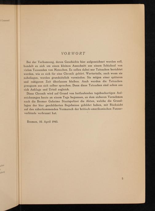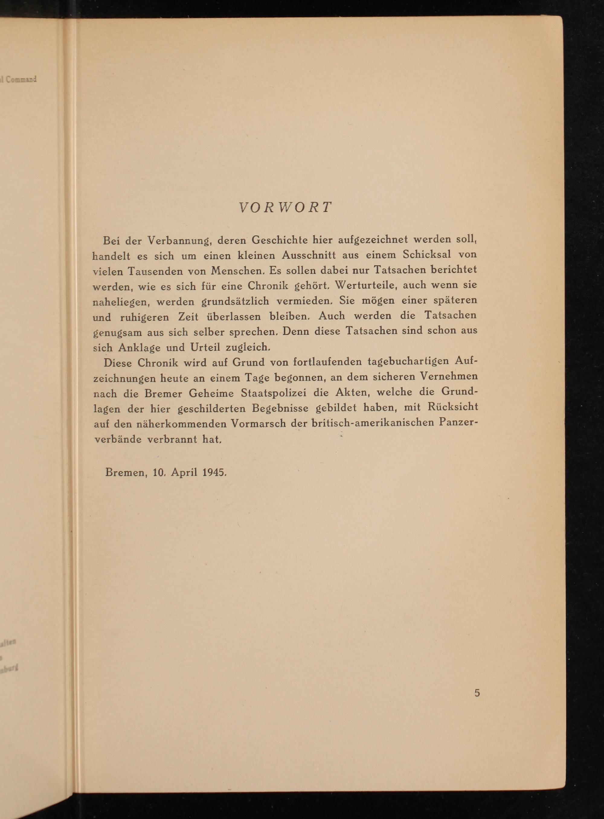 Diese Chronik wird auf Grund von fortlaufenden tagebuchartigen Auf- zeichnungen heute an einem Tage begonnen, an dem sicheren Vernehmen nach die Bremer Geheime Staatspolizei die Akten, welche die Grund- lagen der hier geschilderten Begebnisse gebildet haben, mit Rücksicht auf den näherkommenden Vormarsch der britisch-amerikanischen Panzer- verbände verbrannt hat,