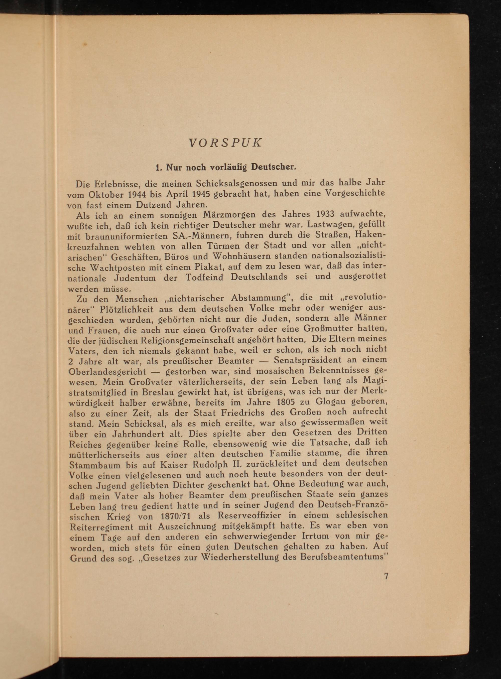 Zu den Menschen„nichtarischer Abstammung‘, die mit„revolutio- närer” Plötzlichkeit aus dem deutschen Volke mehr oder weniger aus- geschieden wurden, gehörten nicht nur die Juden, sondern alle Männer und Frauen, die auch nur einen Großvater oder eine Großmutter hatten, die der jüdischen Religionsgemeinschaft angehört hatten, Die Eltern meines Vaters, den ich niemals gekannt habe, weil er schon, als ich noch nicht 2 Jahre alt war, als preußischer Beamter— Senatspräsident an einem Oberlandesgericht— gestorben war, sind mosaischen Bekenntnisses ge- wesen, Mein Großvater väterlicherseits, der sein Leben lang als Magi- stratsmitglied in Breslau gewirkt hat, ist übrigens, was ich nur der Merk- würdigkeit halber erwähne, bereits im Jahre 1805 zu Glogau geboren, also zu einer Zeit, als der Staat Friedrichs des Großen noch aufrecht stand, Mein Schicksal, als es mich ereilte, war also gewissermaßen weit über ein Jahrhundert alt, Dies spielte aber den Gesetzen des Dritten Reiches gegenüber keine Rolle, ebensowenig wie die Tatsache, daß ich mütterlicherseits aus einer alten deutschen Familie stamme, die ihren Stammbaum bis auf Kaiser Rudolph II, zurückleitet und dem deutschen Volke einen vielgelesenen und auch noch heute besonders von der deut- schen Jugend geliebten Dichter geschenkt hat. Ohne Bedeutung war auch, daß mein Vater als hoher Beamter dem preußischen Staate sein ganzes Leben lang treu gedient hatte und in seiner Jugend den Deutsch -Franzö- sischen Krieg von 1870/71 als Reserveoffizier in einem schlesischen Reiterregiment mit Auszeichnung mitgekämpft hatte. Es war eben von einem Tage auf den anderen ein schwerwiegender Irrtum von mir ge- worden, mich stets für einen guten Deutschen gehalten zu haben. Auf Grund des sog,„Gesetzes zur Wiederherstellung des Berufsbeamtentums ”