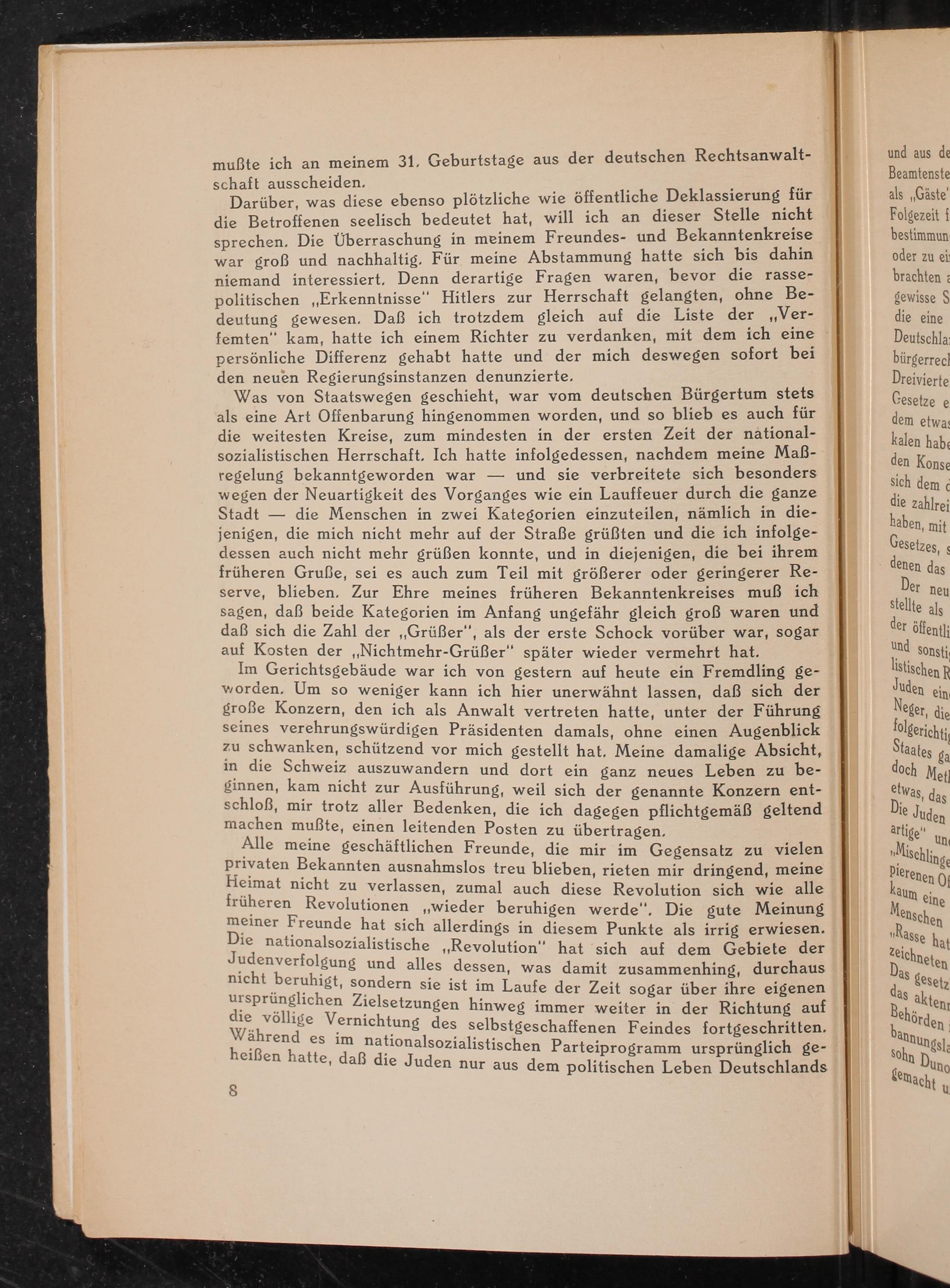Im Gerichtsgebäude war ich von gestern auf heute ein Fremdling geworden. Um so weniger kann ich hier unerwähnt lassen, daß sich der große Konzern, den ich als Anwalt vertreten hatte, unter der Führung seines verehrungswürdigen Präsidenten damals, ohne einen Augenblick zu schwanken, schützend vor mich gestellt hat. Meine damalige Absicht, in die Schweiz auszuwandern und dort ein ganz neues Leben zu beginnen, kam nicht zur Ausführung, weil sich der genannte Konzern entschloß, mir trotz aller Bedenken, die ich dagegen pflichtgemäß geltend machen mußte, einen leitenden Posten zu übertragen.