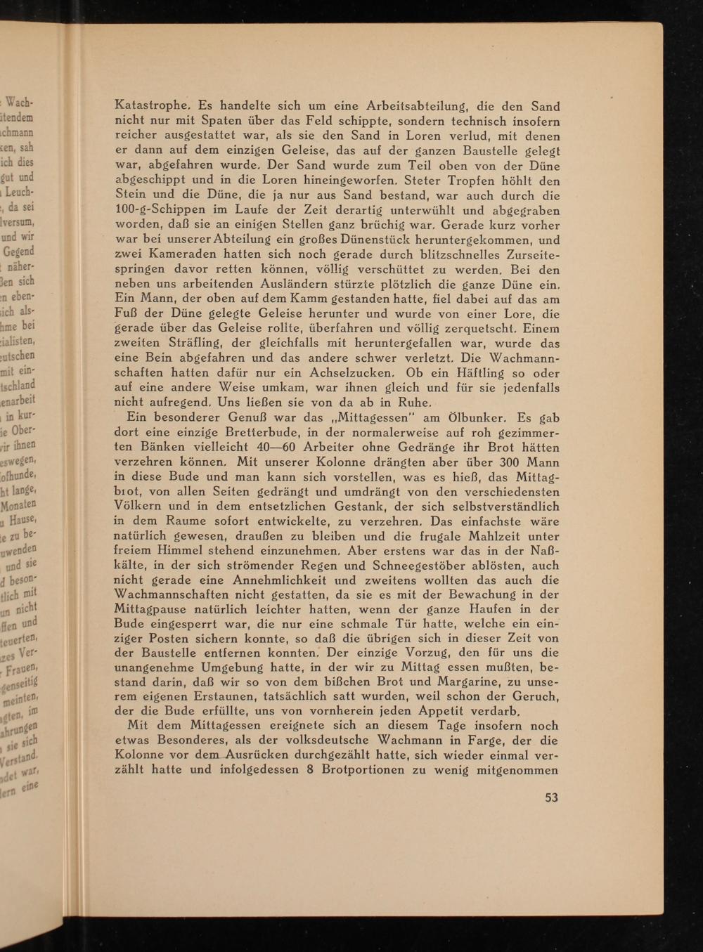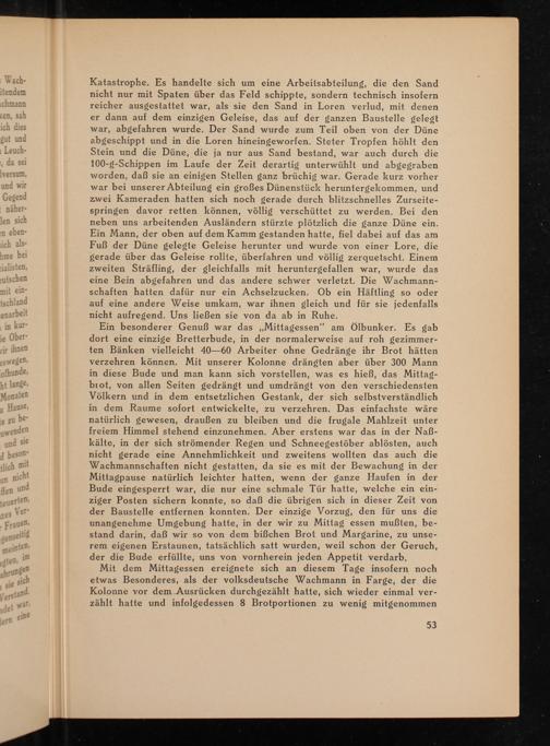 Katastrophe, Es handelte sich um eine Arbeitsabteilung, die den Sand nicht nur mit Spaten über das Feld schippte, sondern technisch insofern reicher ausgestattet war, als sie den Sand in Loren verlud, mit denen er dann auf dem einzigen Geleise, das auf der ganzen Baustelle gelegt war, abgefahren wurde, Der Sand wurde zum Teil oben von der Düne abgeschippt und in die Loren hineingeworfen, Steter Tropfen höhlt den Stein und die Düne, die ja nur aus Sand bestand, war auch durch die 100-8-Schippen im Laufe der Zeit derartig unterwühlt und abgegraben worden, daß sie an einigen Stellen ganz brüchig war, Gerade kurz vorher war bei unserer Abteilung ein großes Dünenstück heruntergekommen, und zwei Kameraden hatten sich noch gerade durch blitzschnelles Zurseite- springen davor retten können, völlig verschüttet zu werden, Bei den neben uns arbeitenden Ausländern stürzte plötzlich die ganze Düne ein. Ein Mann, der oben auf dem Kamm gestanden hatte, fiel dabei auf das am Fuß der Düne gelegte Geleise herunter und wurde von einer Lore, die gerade über das Geleise rollte, überfahren und völlig zerquetscht, Einem zweiten Sträfling, der gleichfalls mit heruntergefallen war, wurde das eine Bein abgefahren und das andere schwer verletzt. Die Wachmann- schaften hatten dafür nur ein Achselzucken. Ob ein Häftling so oder auf eine andere Weise umkam, war ihnen gleich und für sie jedenfalls nicht aufregend, Uns ließen sie von da ab in Ruhe,