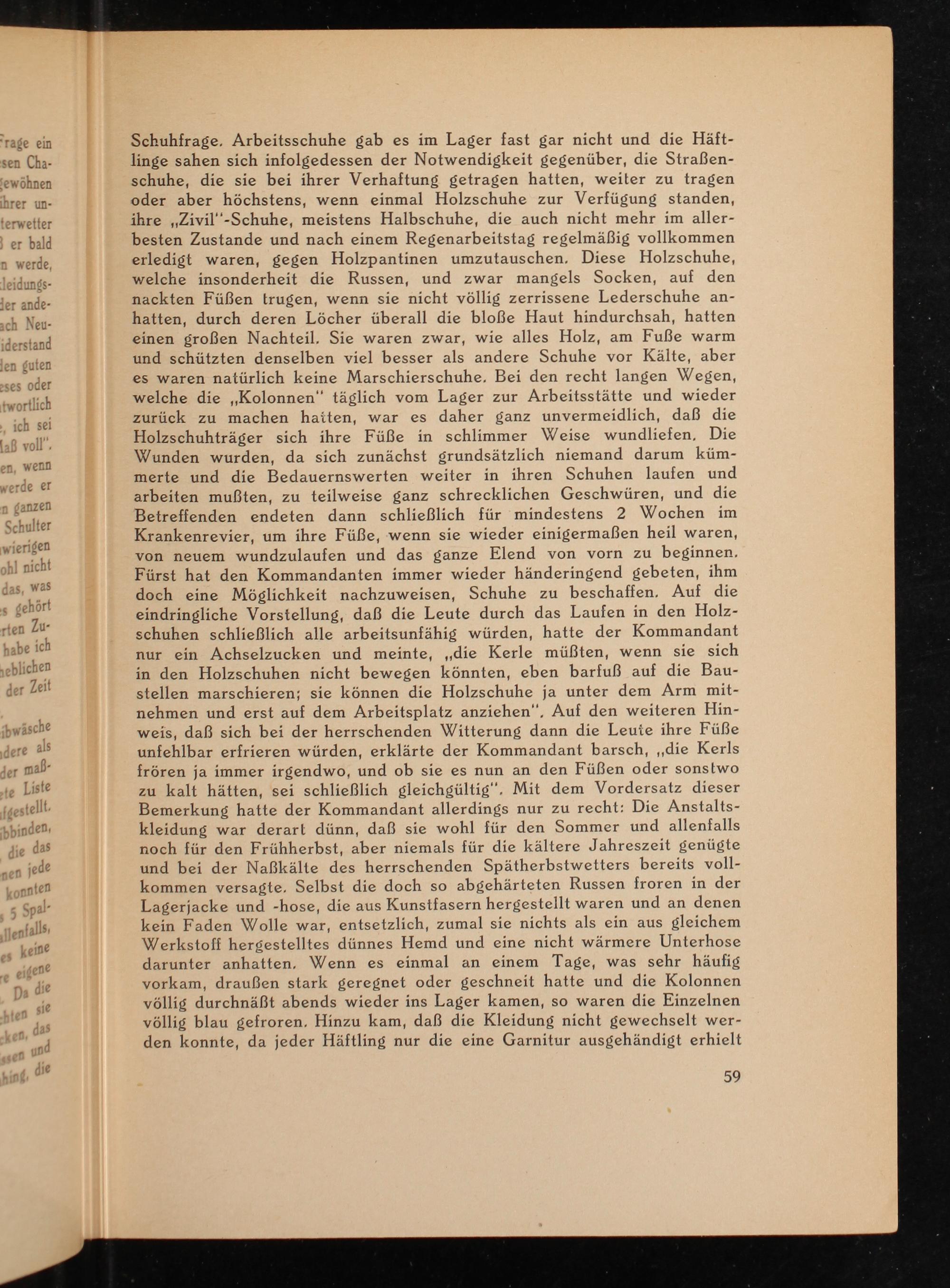 Schuhfrage. Arbeitsschuhe gab es im Lager fast gar nicht und die Häftlinge sahen sich infolgedessen der Notwendigkeit gegenüber, die Straßenschuhe, die sie bei ihrer Verhaftung getragen hatten, weiter zu tragen oder aber höchstens, wenn einmal Holzschuhe zur Verfügung standen, ihre Zivil"-Schuhe, meistens Halbschuhe, die auch nicht mehr im allerbesten Zustande und nach einem Regenarbeitstag regelmäßig vollkommen erledigt waren, gegen Holzpantinen umzutauschen. Diese Holzschuhe, welche insonderheit die Russen, und zwar mangels Socken, auf den nackten Füßen trugen, wenn sie nicht völlig zerrissene Lederschuhe anhatten, durch deren Löcher überall die bloße Haut hindurchsah, hatten einen großen Nachteil. Sie waren zwar, wie alles Holz, am Fuße warm und schützten denselben viel besser als andere Schuhe vor Kälte, aber es waren natürlich keine Marschierschuhe. Bei den recht langen Wegen, welche die ,, Kolonnen" täglich vom Lager zur Arbeitsstätte und wieder zurück zu machen hatten, war es daher ganz unvermeidlich, daß die Holzschuhträger sich ihre Füße in schlimmer Weise wundliefen. Die Wunden wurden, da sich zunächst grundsätzlich niemand darum kümmerte und die Bedauernswerten weiter in ihren Schuhen laufen und arbeiten mußten, zu teilweise ganz schrecklichen Geschwüren, und die Betreffenden endeten dann schließlich für mindestens 2 Wochen im Krankenrevier, um ihre Füße, wenn sie wieder einigermaßen heil waren, von neuem wundzulaufen und das ganze Elend von vorn zu beginnen. Fürst hat den Kommandanten immer wieder händeringend gebeten, ihm doch eine Möglichkeit nachzuweisen, Schuhe zu beschaffen. Auf die eindringliche Vorstellung, daß die Leute durch das Laufen in den Holzschuhen schließlich alle arbeitsunfähig würden, hatte der Kommandant nur ein Achselzucken und meinte, ,, die Kerle müßten, wenn sie sich in den Holzschuhen nicht bewegen könnten, eben barfuß auf die Baustellen marschieren; sie können die Holzschuhe ja unter dem Arm mitnehmen und erst auf dem Arbeitsplatz anziehen". Auf den weiteren Hinweis, daß sich bei der herrschenden Witterung dann die Leute ihre Füße unfehlbar erfrieren würden, erklärte der Kommandant barsch ,,, die Kerls frören ja immer irgendwo, und ob sie es nun an den Füßen oder sonstwo zu kalt hätten, sei schließlich gleichgültig". Mit dem Vordersatz dieser Bemerkung hatte der Kommandant allerdings nur zu recht: Die Anstaltskleidung war derart dünn, daß sie wohl für den Sommer und allenfalls noch für den Frühherbst, aber niemals für die kältere Jahreszeit genügte und bei der Naẞkälte des herrschenden Spätherbstwetters bereits vollkommen versagte. Selbst die doch so abgehärteten Russen froren in der Lagerjacke und-hose, die aus Kunstfasern hergestellt waren und an denen kein Faden Wolle war, entsetzlich, zumal sie nichts als ein aus gleichem Werkstoff hergestelltes dünnes Hemd und eine nicht wärmere Unterhose darunter anhatten. Wenn es einmal an einem Tage, was sehr häufig vorkam, draußen stark geregnet oder geschneit hatte und die Kolonnen völlig durchnäßt abends wieder ins Lager kamen, so waren die Einzelnen völlig blau gefroren. Hinzu kam, daß die Kleidung nicht gewechselt werden konnte, da jeder Häftling nur die eine Garnitur ausgehändigt erhielt