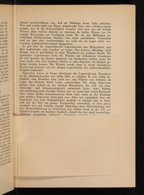 Zigaretten waren in Farge überhaupt die Lagerwährung. Besonders in der Handwerksstube war dafür alles zu erhalten. Es war völlig unmöglich, zum Besohlen oder auch nur zum Flicken von Schuhen im Lager das kleinste Stück Leder aufzutreiben. Für einige Zigaretten bekam man jedoch in der kleinen Manufaktur, die sich aus einer Schneider- und Schusterwerkstatt entwickelt hatte, seine Schuhe mit tadellosem Leder besohlt. Ebenso war es, wenn man seinen Rucksack oder seinen Koffer instandzusetzen hatte oder wenn an der Kleidung eine größere Reparatur notwendig war. Alles war unmöglich, aber mit Zigaretten war jede Unmöglichkeit möglich zu machen und es hatte sich mit der Zeit ein ganzer Preiskatalog entwickelt, in dem genau normiert war, mit welcher Anzahl Zigaretten diese Dienstleistung und jene Materiallieferung zu honorieren war. Dabei stand an der Tür zur Handwerksstube die lapidare Inschrift ,, Zutritt für hier nicht beschäftigte Häftlinge strengstens verboten"
