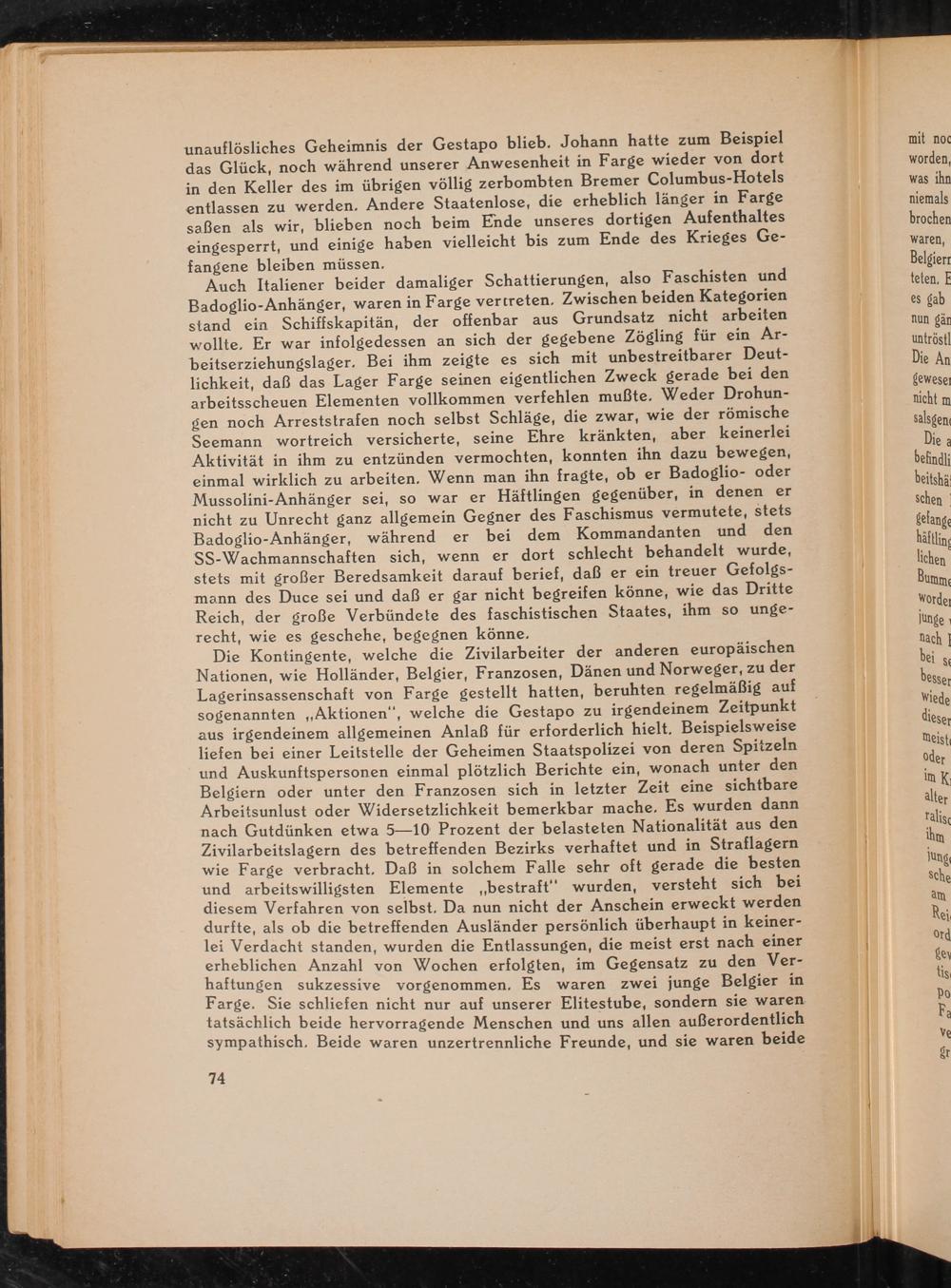 unauflösliches Geheimnis der Gestapo blieb. Johann hatte zum Beispiel das Glück, noch während unserer Anwesenheit in Farge wieder von dort in den Keller des im übrigen völlig zerbombten Bremer Columbus- Hotels entlassen zu werden. Andere Staatenlose, die erheblich länger in Farge saẞen als wir, blieben noch beim Ende unseres dortigen Aufenthaltes eingesperrt, und einige haben vielleicht bis zum Ende des Krieges Gefangene bleiben müssen.