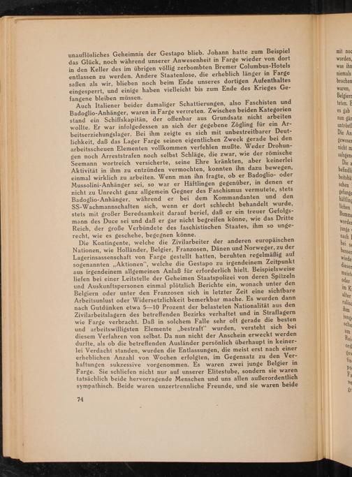 Auch Italiener beider damaliger Schattierungen, also Faschisten und Badoglio - Anhänger, waren in Farge vertreten. Zwischen beiden Kategorien stand ein Schiffskapitän, der offenbar aus Grundsatz nicht arbeiten wollte. Er war infolgedessen an sich der gegebene Zögling für ein Arbeitserziehungslager. Bei ihm zeigte es sich mit unbestreitbarer Deutlichkeit, daß das Lager Farge seinen eigentlichen Zweck gerade bei den arbeitsscheuen Elementen vollkommen verfehlen mußte. Weder Drohungen noch Arreststrafen noch selbst Schläge, die zwar, wie der römische Seemann wortreich versicherte, seine Ehre kränkten, aber keinerlei Aktivität in ihm zu entzünden vermochten, konnten ihn dazu bewegen, einmal wirklich zu arbeiten. Wenn man ihn fragte, ob er Badoglio - oder Mussolini - Anhänger sei, so war er Häftlingen gegenüber, in denen er nicht zu Unrecht ganz allgemein Gegner des Faschismus vermutete, stets Badoglio - Anhänger, während er bei dem Kommandanten und den SS- Wachmannschaften sich, wenn er dort schlecht behandelt wurde, stets mit großer Beredsamkeit darauf berief, daß er ein treuer Gefolgsmann des Duce sei und daß er gar nicht begreifen könne, wie das Dritte Reich, der große Verbündete des faschistischen Staates, ihm so ungerecht, wie es geschehe, begegnen könne.