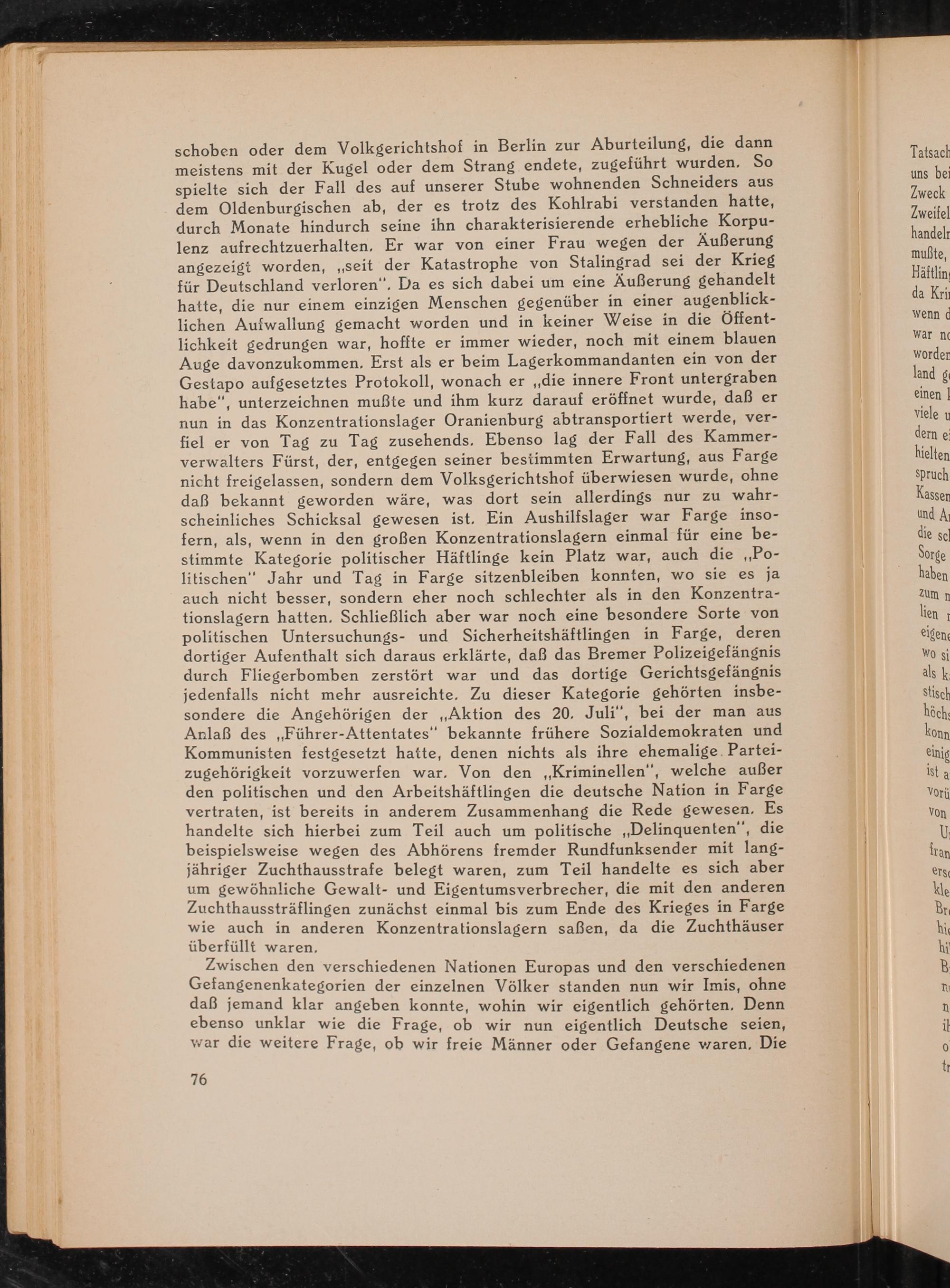 schoben oder dem Volkgerichtshof in Berlin zur Aburteilung, die dann meistens mit der Kugel oder dem Strang endete, zugeführt wurden. So spielte sich der Fall des auf unserer Stube wohnenden Schneiders aus dem Oldenburgischen ab, der es trotz des Kohlrabi verstanden hatte, durch Monate hindurch seine ihn charakterisierende erhebliche Korpulenz aufrechtzuerhalten. Er war von einer Frau wegen der Äußerung angezeigt worden ,,, seit der Katastrophe von Stalingrad sei der Krieg für Deutschland verloren". Da es sich dabei um eine Äußerung gehandelt hatte, die nur einem einzigen Menschen gegenüber in einer augenblicklichen Aufwallung gemacht worden und in keiner Weise in die Öffentlichkeit gedrungen war, hoffte er immer wieder, noch mit einem blauen Auge davonzukommen. Erst als er beim Lagerkommandanten ein von der Gestapo aufgesetztes Protokoll, wonach er ,, die innere Front untergraben habe", unterzeichnen mußte und ihm kurz darauf eröffnet wurde, daß er nun in das Konzentrationslager Oranienburg abtransportiert werde, verfiel er von Tag zu Tag zusehends. Ebenso lag der Fall des Kammerverwalters Fürst, der, entgegen seiner bestimmten Erwartung, aus Farge nicht freigelassen, sondern dem Volksgerichtshof überwiesen wurde, ohne daß bekannt geworden wäre, was dort sein allerdings nur zu wahrscheinliches Schicksal gewesen ist. Ein Aushilfslager war Farge insofern, als, wenn in den großen Konzentrationslagern einmal für eine bestimmte Kategorie politischer Häftlinge kein Platz war, auch die ,, Politischen" Jahr und Tag in Farge sitzenbleiben konnten, wo sie es ja auch nicht besser, sondern eher noch schlechter als in den Konzentrationslagern hatten. Schließlich aber war noch eine besondere Sorte von politischen Untersuchungs- und Sicherheitshäftlingen in Farge , deren dortiger Aufenthalt sich daraus erklärte, daß das Bremer Polizeigefängnis durch Fliegerbomben zerstört war und das dortige Gerichtsgefängnis jedenfalls nicht mehr ausreichte. Zu dieser Kategorie gehörten insbesondere die Angehörigen der Aktion des 20. Juli", bei der man aus Anlaß des„ Führer- Attentates" bekannte frühere Sozialdemokraten und Kommunisten festgesetzt hatte, denen nichts als ihre ehemalige Parteizugehörigkeit vorzuwerfen war. Von den ,, Kriminellen ", welche außer den politischen und den Arbeitshäftlingen die deutsche Nation in Farge vertraten, ist bereits in anderem Zusammenhang die Rede gewesen. Es handelte sich hierbei zum Teil auch um politische ,, Delinquenten ", die beispielsweise wegen des Abhörens fremder Rundfunksender mit langjähriger Zuchthausstrafe belegt waren, zum Teil handelte es sich aber um gewöhnliche Gewalt- und Eigentumsverbrecher, die mit den anderen Zuchthaussträflingen zunächst einmal bis zum Ende des Krieges in Farge wie auch in anderen Konzentrationslagern saßen, da die Zuchthäuser überfüllt waren,