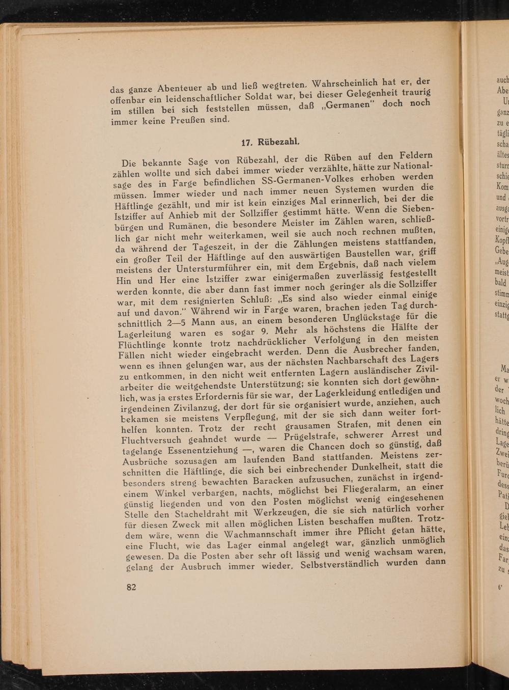 Die bekannte Sage von Rübezahl , der die Rüben auf den Feldern zählen wollte und sich dabei immer wieder verzählte, hätte zur Nationalsage des in Farge befindlichen SS- Germanen- Volkes erhoben werden müssen. Immer wieder und nach immer neuen Systemen wurden die Häftlinge gezählt, und mir ist kein einziges Mal erinnerlich, bei der die Istziffer auf Anhieb mit der Sollziffer gestimmt hätte. Wenn die Siebenbürgen und Rumänen, die besondere Meister im Zählen waren, schlieẞlich gar nicht mehr weiterkamen, weil sie auch noch rechnen mußten, da während der Tageszeit, in der die Zählungen meistens stattfanden, ein großer Teil der Häftlinge auf den auswärtigen Baustellen war, griff meistens der Untersturmführer ein, mit dem Ergebnis, daß nach vielem Hin und Her eine Istziffer zwar einigermaßen zuverlässig festgestellt werden konnte, die aber dann fast immer noch geringer als die Sollziffer war, mit dem resignierten Schluß: ,, Es sind also wieder einmal einige auf und davon." Während wir in Farge waren, brachen jeden Tag durchschnittlich 2-5 Mann aus, an einem besonderen Unglückstage für die Lagerleitung waren es sogar 9. Mehr als höchstens die Hälfte der Flüchtlinge konnte trotz nachdrücklicher Verfolgung in den meisten Fällen nicht wieder eingebracht werden. Denn die Ausbrecher fanden, wenn es ihnen gelungen war, aus der nächsten Nachbarschaft des Lagers zu entkommen, in den nicht weit entfernten Lagern ausländischer Zivilarbeiter die weitgehendste Unterstützung; sie konnten sich dort gewöhnlich, was ja erstes Erfordernis für sie war, der Lagerkleidung entledigen und irgendeinen Zivilanzug, der dort für sie organisiert wurde, anziehen, auch bekamen sie meistens Verpflegung, mit der sie sich dann weiter forthelfen konnten. Trotz der recht grausamen Strafen, mit denen ein Fluchtversuch geahndet wurde Prügelstrafe, schwerer Arrest und