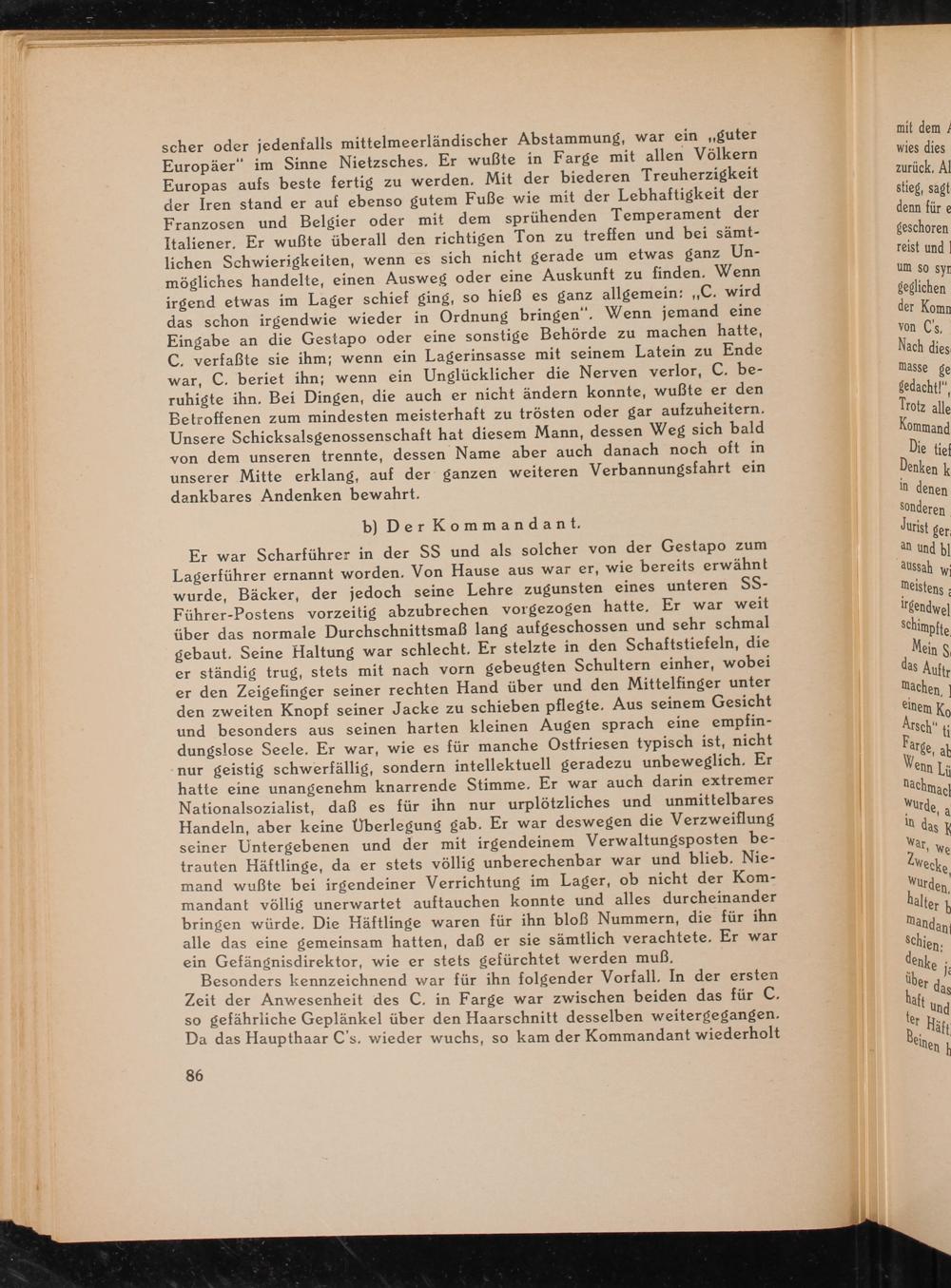 scher oder jedenfalls mittelmeerländischer Abstammung, war ein guter Europäer" im Sinne Nietzsches. Er wußte in Farge mit allen Völkern Europas aufs beste fertig zu werden. Mit der biederen Treuherzigkeit der Iren stand er auf ebenso gutem Fuße wie mit der Lebhaftigkeit der Franzosen und Belgier oder mit dem sprühenden Temperament der Italiener. Er wußte überall den richtigen Ton zu treffen und bei sämtlichen Schwierigkeiten, wenn es sich nicht gerade um etwas ganz Unmögliches handelte, einen Ausweg oder eine Auskunft zu finden. Wenn irgend etwas im Lager schief ging, so hieß es ganz allgemein: ,, C. wird das schon irgendwie wieder in Ordnung bringen". Wenn jemand eine Eingabe an die Gestapo oder eine sonstige Behörde zu machen hatte, C. verfaßte sie ihm; wenn ein Lagerinsasse mit seinem Latein zu Ende war, C. beriet ihn; wenn ein Unglücklicher die Nerven verlor, C. beruhigte ihn. Bei Dingen, die auch er nicht ändern konnte, wußte er den Betroffenen zum mindesten meisterhaft zu trösten oder gar aufzuheitern. Unsere Schicksalsgenossenschaft hat diesem Mann, dessen Weg sich bald von dem unseren trennte, dessen Name aber auch danach noch oft in unserer Mitte erklang, auf der ganzen weiteren Verbannungsfahrt ein dankbares Andenken bewahrt.