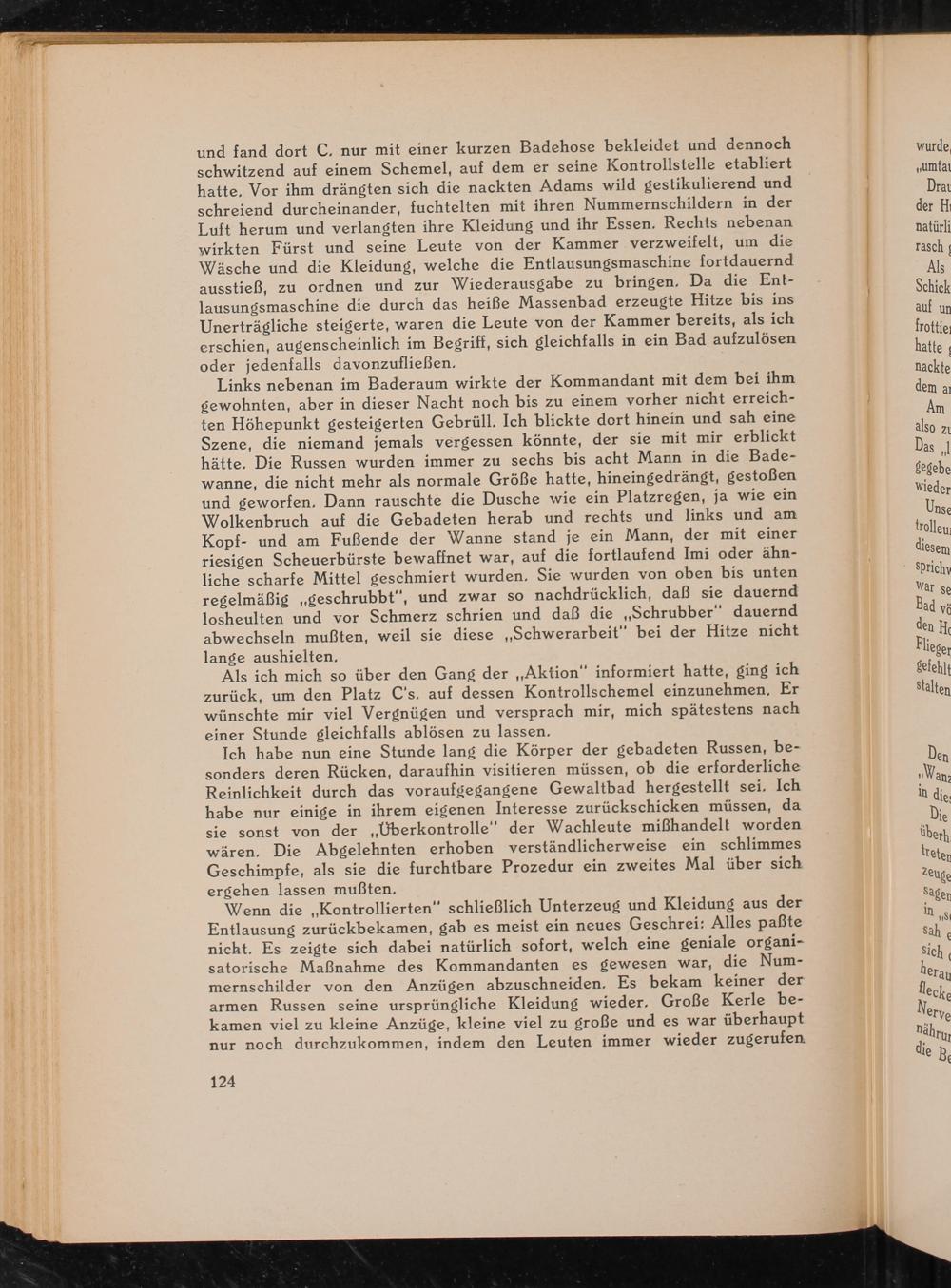 und fand dort C. nur mit einer kurzen Badehose bekleidet und dennoch schwitzend auf einem Schemel, auf dem er seine Kontrollstelle etabliert hatte. Vor ihm drängten sich die nackten Adams wild gestikulierend und schreiend durcheinander, fuchtelten mit ihren Nummernschildern in der Luft herum und verlangten ihre Kleidung und ihr Essen. Rechts nebenan wirkten Fürst und seine Leute von der Kammer verzweifelt, um die Wäsche und die Kleidung, welche die Entlausungsmaschine fortdauernd ausstieẞ, zu ordnen und zur Wiederausgabe zu bringen. Da die Entlausungsmaschine die durch das heiße Massenbad erzeugte Hitze bis ins Unerträgliche steigerte, waren die Leute von der Kammer bereits, als ich erschien, augenscheinlich im Begriff, sich gleichfalls in ein Bad aufzulösen oder jedenfalls davonzufließen.