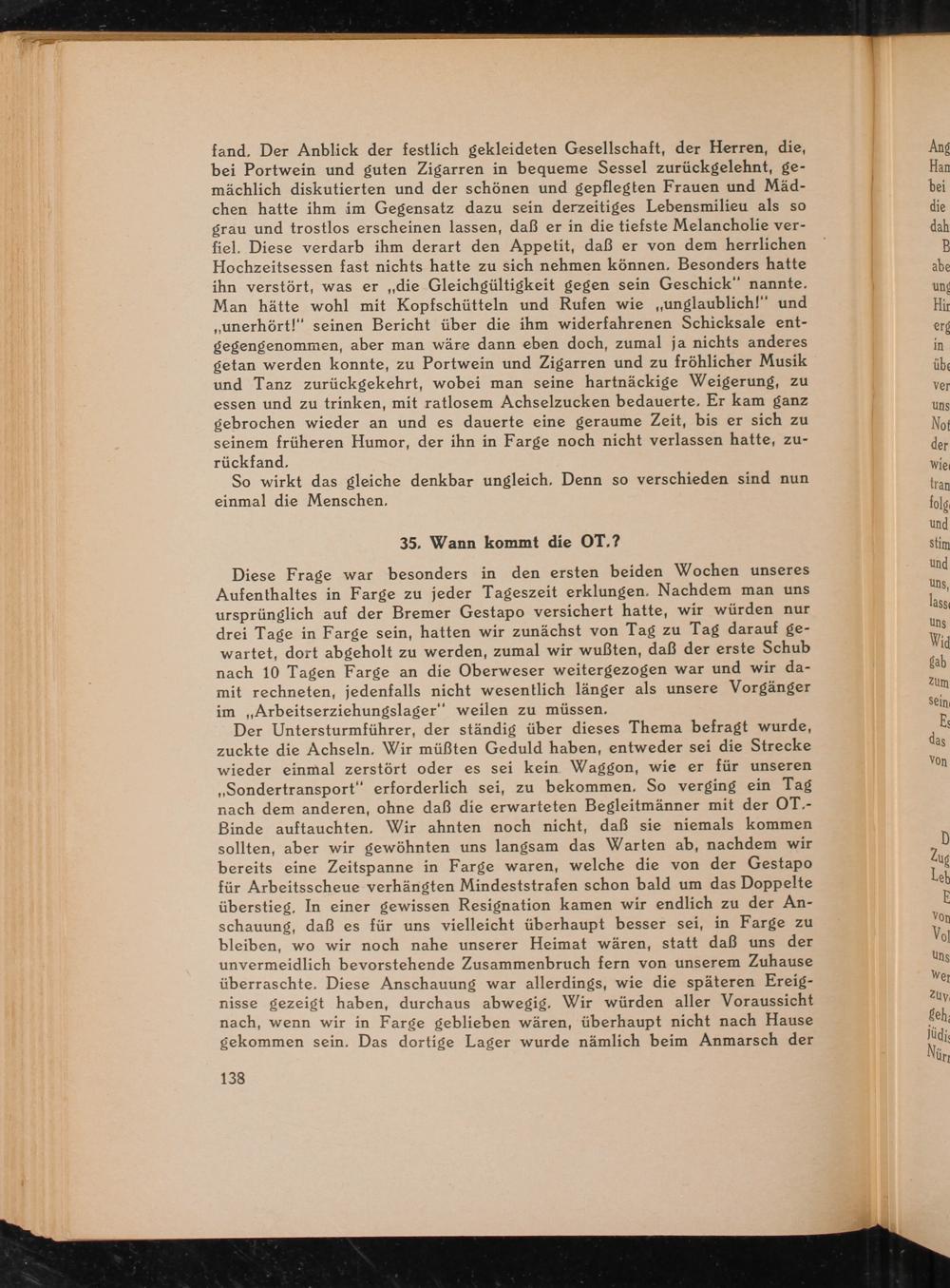 Diese Frage war besonders in den ersten beiden Wochen unseres Aufenthaltes in Farge zu jeder Tageszeit erklungen. Nachdem man uns ursprünglich auf der Bremer Gestapo versichert hatte, wir würden nur drei Tage in Farge sein, hatten wir zunächst von Tag zu Tag darauf gewartet, dort abgeholt zu werden, zumal wir wußten, daß der erste Schub nach 10 Tagen Farge an die Oberweser weitergezogen war und wir damit rechneten, jedenfalls nicht wesentlich länger als unsere Vorgänger im ,, Arbeitserziehungslager" weilen zu müssen.