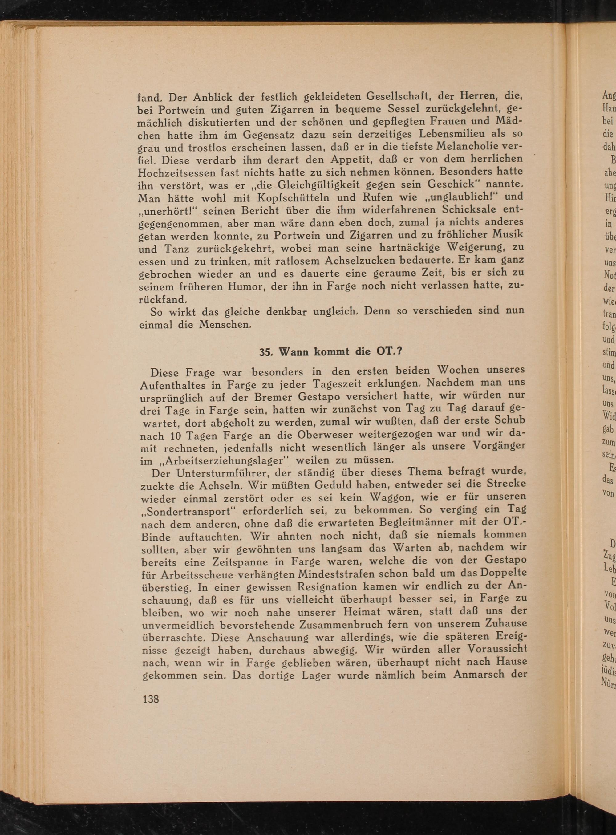 Der Untersturmführer, der ständig über dieses Thema befragt wurde, zuckte die Achseln. Wir müßten Geduld haben, entweder sei die Strecke wieder einmal zerstört oder es sei kein Waggon, wie er für unseren ,, Sondertransport" erforderlich sei, zu bekommen. So verging ein Tag nach dem anderen, ohne daß die erwarteten Begleitmänner mit der OT.Binde auftauchten. Wir ahnten noch nicht, daß sie niemals kommen sollten, aber wir gewöhnten uns langsam das Warten ab, nachdem wir bereits eine Zeitspanne in Farge waren, welche die von der Gestapo für Arbeitsscheue verhängten Mindeststrafen schon bald um das Doppelte überstieg. In einer gewissen Resignation kamen wir endlich zu der Anschauung, daß es für uns vielleicht überhaupt besser sei, in Farge zu bleiben, wo wir noch nahe unserer Heimat wären, statt daß uns der unvermeidlich bevorstehende Zusammenbruch fern von unserem Zuhause überraschte. Diese Anschauung war allerdings, wie die späteren Ereignisse gezeigt haben, durchaus abwegig. Wir würden aller Voraussicht nach, wenn wir in Farge geblieben wären, überhaupt nicht nach Hause gekommen sein. Das dortige Lager wurde nämlich beim Anmarsch der