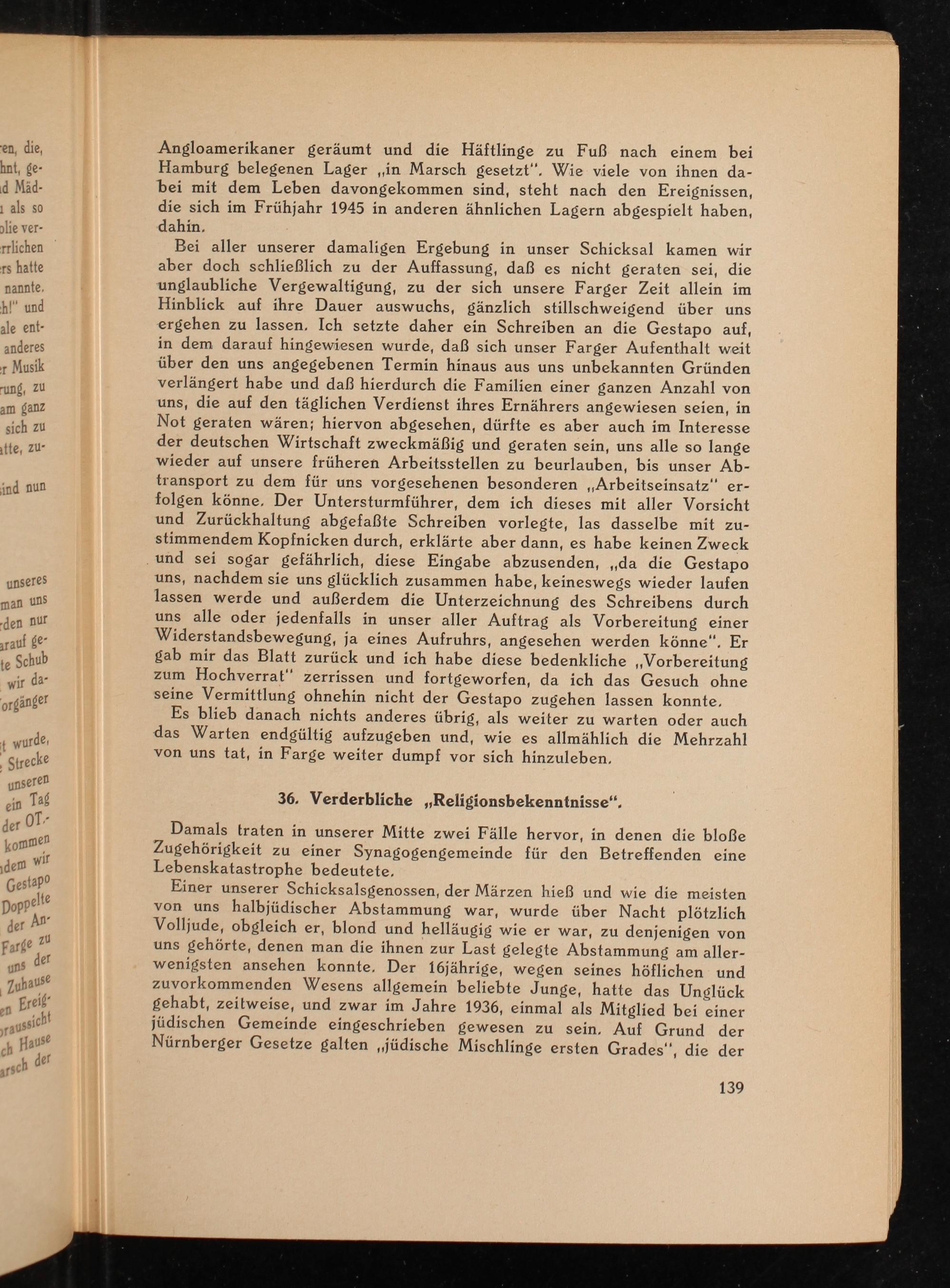 Bei aller unserer damaligen Ergebung in unser Schicksal kamen wir aber doch schließlich zu der Auffassung, daß es nicht geraten sei, die unglaubliche Vergewaltigung, zu der sich unsere Farger Zeit allein im Hinblick auf ihre Dauer auswuchs, gänzlich stillschweigend über uns ergehen zu lassen. Ich setzte daher ein Schreiben an die Gestapo auf, in dem darauf hingewiesen wurde, daß sich unser Farger Aufenthalt weit über den uns angegebenen Termin hinaus aus uns unbekannten Gründen verlängert habe und daß hierdurch die Familien einer ganzen Anzahl von uns, die auf den täglichen Verdienst ihres Ernährers angewiesen seien, in Not geraten wären; hiervon abgesehen, dürfte es aber auch im Interesse der deutschen Wirtschaft zweckmäßig und geraten sein, uns alle so lange wieder auf unsere früheren Arbeitsstellen zu beurlauben, bis unser Ab- transport zu dem für uns vorgesehenen besonderen„Arbeitseinsatz er- folgen könne, Der Untersturmführer, dem ich dieses mit aller Vorsicht und Zurückhaltung abgefaßte Schreiben vorlegte, las dasselbe mit zu- stimmendem Kopfnicken durch, erklärte aber dann, es habe keinen Zweck