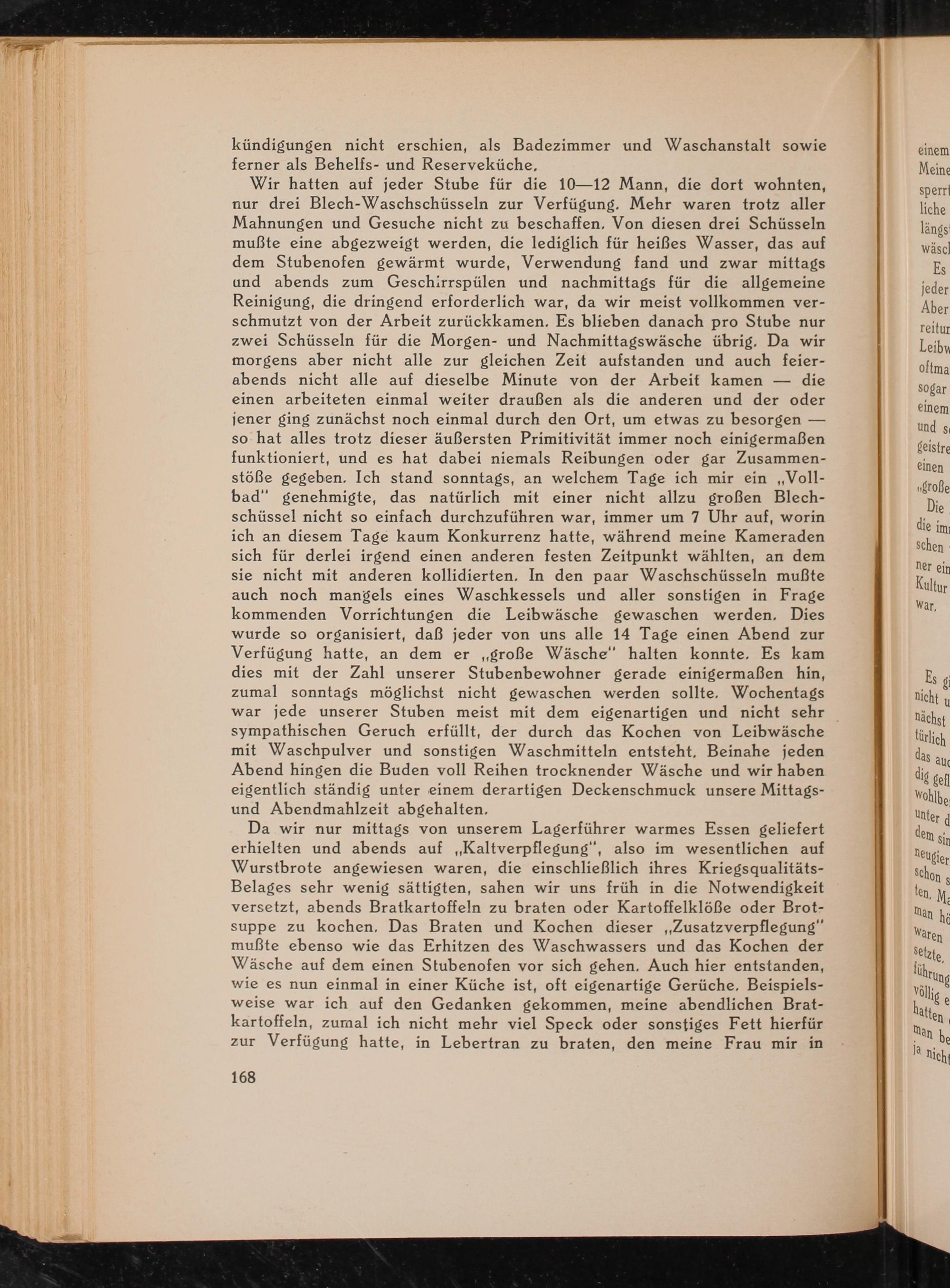 Da wir nur mittags von unserem Lagerführer warmes Essen geliefert erhielten und abends auf ,, Kaltverpflegung", also im wesentlichen auf Wurstbrote angewiesen waren, die einschließlich ihres KriegsqualitätsBelages sehr wenig sättigten, sahen wir uns früh in die Notwendigkeit versetzt, abends Bratkartoffeln zu braten oder Kartoffelklöße oder Brotsuppe zu kochen. Das Braten und Kochen dieser ,, Zusatzverpflegung" mußte ebenso wie das Erhitzen des Waschwassers und das Kochen der Wäsche auf dem einen Stubenofen vor sich gehen. Auch hier entstanden, wie es nun einmal in einer Küche ist, oft eigenartige Gerüche. Beispielsweise war ich auf den Gedanken gekommen, meine abendlichen Bratkartoffeln, zumal ich nicht mehr viel Speck oder sonstiges Fett hierfür zur Verfügung hatte, in Lebertran zu braten, den meine Frau mir in 168