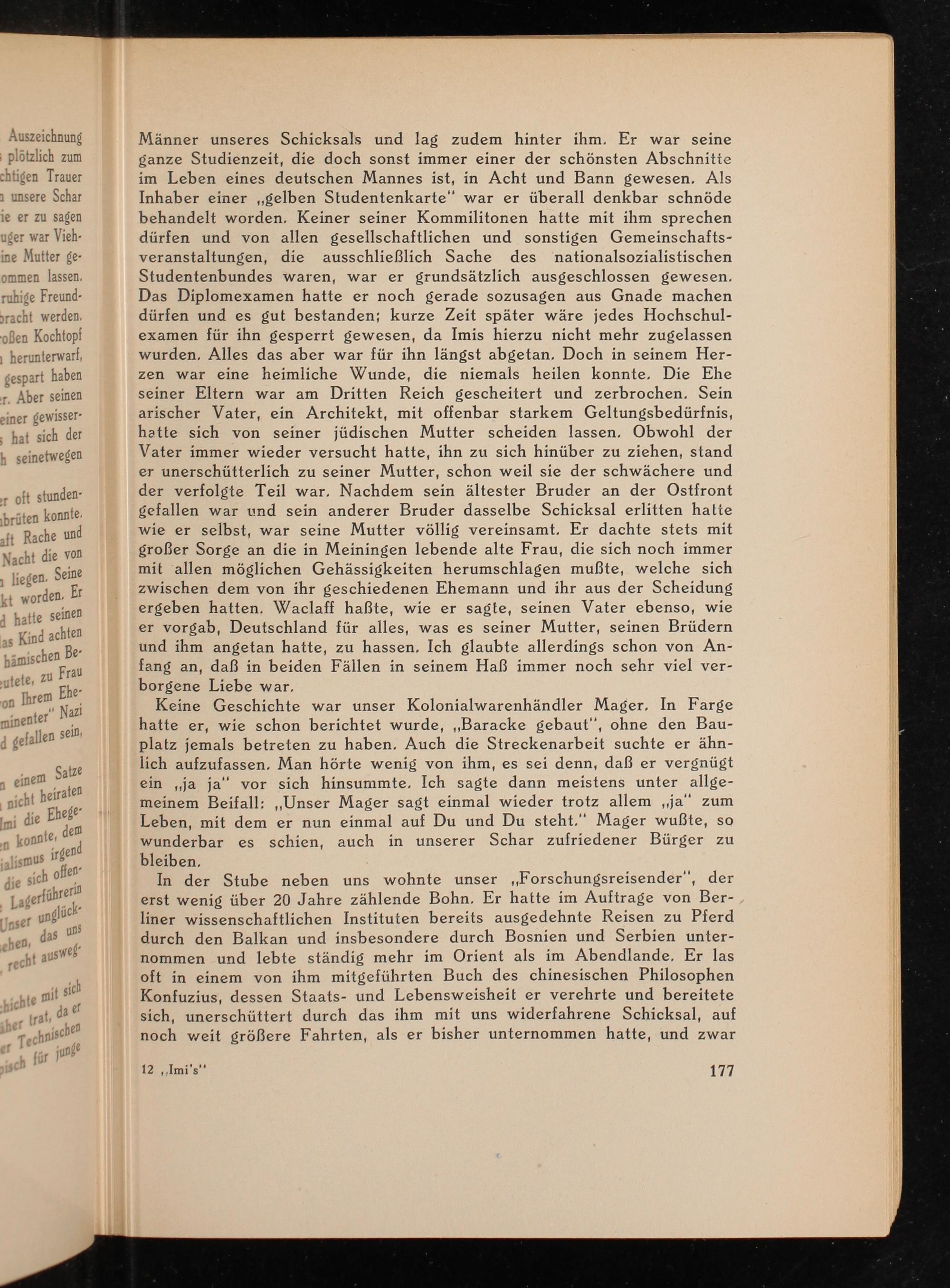 In der Stube neben uns wohnte unser ,, Forschungsreisender", der erst wenig über 20 Jahre zählende Bohn. Er hatte im Auftrage von Berliner wissenschaftlichen Instituten bereits ausgedehnte Reisen zu Pferd durch den Balkan und insbesondere durch Bosnien und Serbien unternommen und lebte ständig mehr im Orient als im Abendlande. Er las oft in einem von ihm mitgeführten Buch des chinesischen Philosophen Konfuzius , dessen Staats- und Lebensweisheit er verehrte und bereitete sich, unerschüttert durch das ihm mit uns widerfahrene Schicksal, auf noch weit größere Fahrten, als er bisher unternommen hatte, und zwar