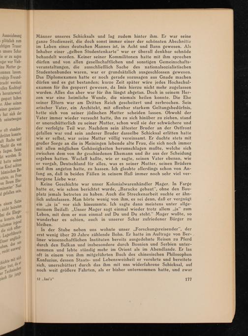 Männer unseres Schicksals und lag zudem hinter ihm. Er war seine ganze Studienzeit, die doch sonst immer einer der schönsten Abschnitte im Leben eines deutschen Mannes ist, in Acht und Bann gewesen. Als Inhaber einer gelben Studentenkarte" war er überall denkbar schnöde behandelt worden. Keiner seiner Kommilitonen hatte mit ihm sprechen dürfen und von allen gesellschaftlichen und sonstigen Gemeinschaftsveranstaltungen, die ausschließlich Sache des nationalsozialistischen Studentenbundes waren, war er grundsätzlich ausgeschlossen gewesen. Das Diplomexamen hatte er noch gerade sozusagen aus Gnade machen dürfen und es gut bestanden; kurze Zeit später wäre jedes Hochschulexamen für ihn gesperrt gewesen, da Imis hierzu nicht mehr zugelassen wurden. Alles das aber war für ihn längst abgetan. Doch in seinem Herzen war eine heimliche Wunde, die niemals heilen konnte. Die Ehe seiner Eltern war am Dritten Reich gescheitert und zerbrochen. Sein arischer Vater, ein Architekt, mit offenbar starkem Geltungsbedürfnis, hatte sich von seiner jüdischen Mutter scheiden lassen. Obwohl der Vater immer wieder versucht hatte, ihn zu sich hinüber zu ziehen, stand er unerschütterlich zu seiner Mutter, schon weil sie der schwächere und der verfolgte Teil war. Nachdem sein ältester Bruder an der Ostfront gefallen war und sein anderer Bruder dasselbe Schicksal erlitten hatte wie er selbst, war seine Mutter völlig vereinsamt. Er dachte stets mit großer Sorge an die in Meiningen lebende alte Frau, die sich noch immer mit allen möglichen Gehässigkeiten herumschlagen mußte, welche sich zwischen dem von ihr geschiedenen Ehemann und ihr aus der Scheidung ergeben hatten. Waclaff haẞte, wie er sagte, seinen Vater ebenso, wie er vorgab, Deutschland für alles, was es seiner Mutter, seinen Brüdern und ihm angetan hatte, zu hassen. Ich glaubte allerdings schon von Anfang an, daß in beiden Fällen in seinem Haß immer noch sehr viel verborgene Liebe war.