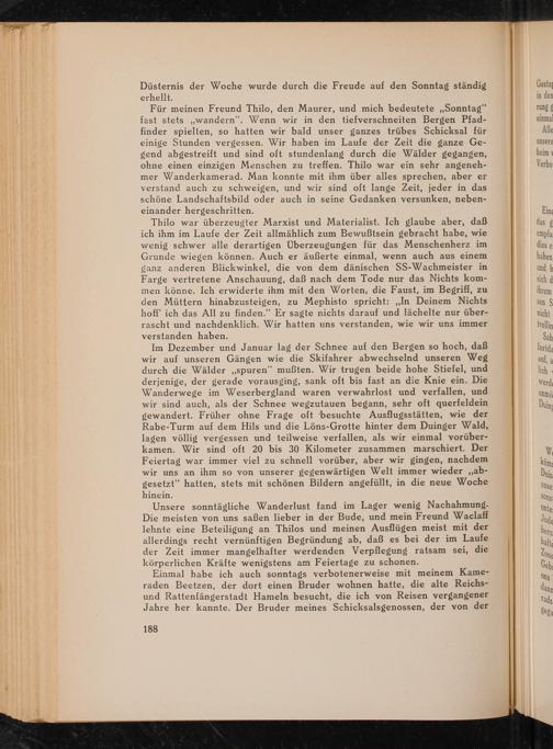 Thilo war überzeugter Marxist und Materialist. Ich glaube aber, daß ich ihm im Laufe der Zeit allmählich zum Bewußtsein gebracht habe, wie wenig schwer alle derartigen Überzeugungen für das Menschenherz im Grunde wiegen können. Auch er äußerte einmal, wenn auch aus einem ganz anderen Blickwinkel, die von dem dänischen SS- Wachmeister in Farge vertretene Anschauung, daß nach dem Tode nur das Nichts kommen könne. Ich erwiderte ihm mit den Worten, die Faust, im Begriff, zu den Müttern hinabzusteigen, zu Mephisto spricht: ,, In Deinem Nichts hoff' ich das All zu finden." Er sagte nichts darauf und lächelte nur überrascht und nachdenklich. Wir hatten uns verstanden, wie wir uns immer verstanden haben.