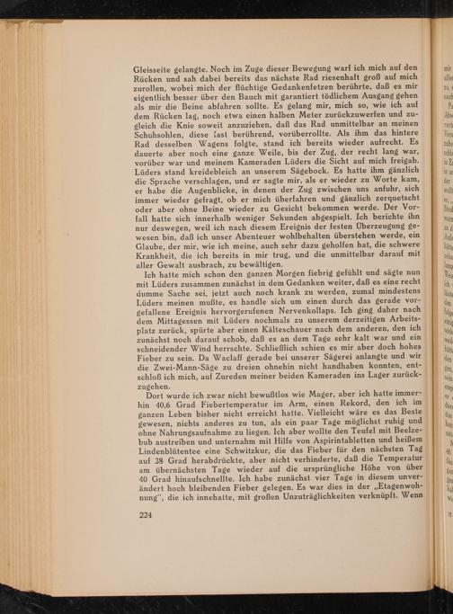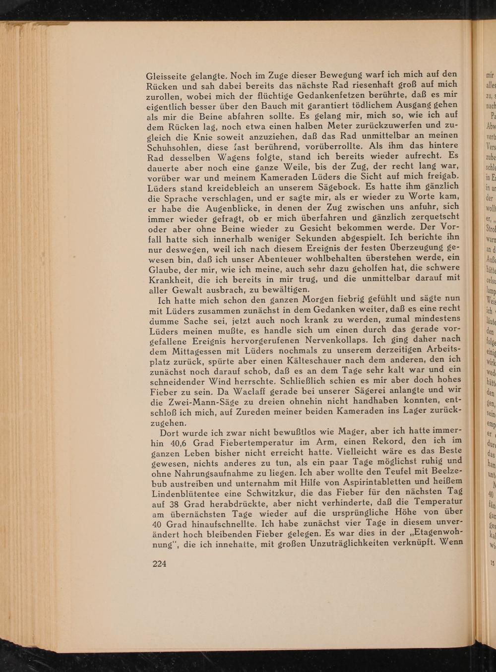 Gleisseite gelangte, Noch im Zuge dieser Bewegung warf ich mich auf den Rücken und sah dabei bereits das nächste Rad riesenhaft groß auf mich zurollen, wobei mich der flüchtige Gedankenfetzen berührte, daß es mir eigentlich besser über den Bauch mit garantiert tödlichem Ausgang gehen als mir die Beine. abfahren sollte. Es gelang mir, mich so, wie ich auf dem Rücken lag, noch etwa einen halben Meter zurückzuwerfen und zu- gleich die Knie soweit anzuziehen, daß das Rad unmittelbar an meinen Schuhsohlen, diese fast berührend, vorüberrollte, Als ihm das hintere Rad desselben Wagens folgte, stand ich bereits wieder aufrecht. Es dauerte aber noch eine ganze Weile, bis der Zug, der recht lang war, vorüber war und meinem Kameraden Lüders die Sicht auf mich freigab. Lüders stand kreidebleich an unserem Sägebock. Es hatte ihm gänzlich die Sprache verschlagen, und er sagte mir, als er wieder zu Worte kam, er habe die Augenblicke, in denen der Zug zwischen uns anfuhr, sich immer wieder gefragt, ob er mich überfahren und gänzlich zerquetscht oder aber ohne Beine wieder zu Gesicht bekommen werde. Der Vor- fall hatte sich innerhalb weniger Sekunden abgespielt. Ich berichte ihn nur deswegen, weil ich nach diesem Ereignis der festen Überzeugung ge- wesen bin, daß ich unser Abenteuer wohlbehalten überstehen werde, ein Glaube, der mir, wie ich meine, auch sehr dazu geholfen hat, die schwere Krankheit, die ich bereits in mir trug, und die unmittelbar darauf mit aller Gewalt ausbrach, zu bewältigen.