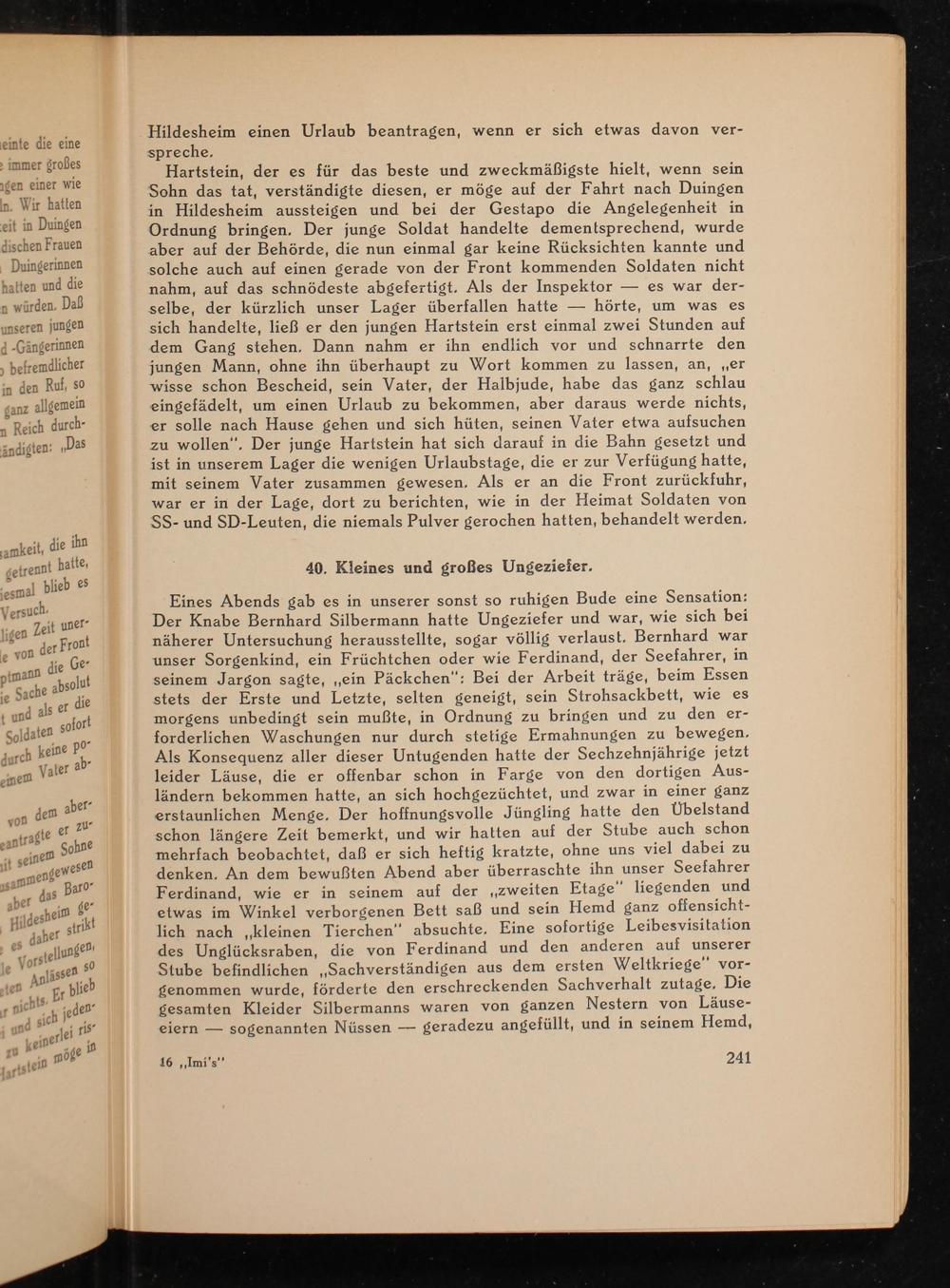 Hartstein, der es für das beste und zweckmäßigste hielt, wenn sein Sohn das tat, verständigte diesen, er möge auf der Fahrt nach Duingen in Hildesheim aussteigen und bei der Gestapo die Angelegenheit in Ordnung bringen. Der junge Soldat handelte dementsprechend, wurde aber auf der Behörde, die nun einmal gar keine Rücksichten kannte und solche auch auf einen gerade von der Front kommenden Soldaten nicht nahm, auf das schnödeste abgefertist. Als der Inspektor— es war der- selbe, der kürzlich unser Lager überfallen hatte— hörte, um was es sich handelte, ließ er den jungen Hartstein erst einmal zwei Stunden auf| dem Gang stehen, Dann nahm er ihn endlich vor und schnarrte den jungen Mann, ohne ihn überhaupt zu Wort kommen zu lassen, an,„er wisse schon Bescheid, sein Vater, der Halbjude, habe das ganz schlau eingefädelt, um einen Urlaub zu bekommen, aber daraus werde nichts, er solle nach Hause gehen und sich hüten, seinen Vater etwa aufsuchen zu wollen”, Der junge Hartstein hat sich darauf in die Bahn gesetzt und ist in unserem Lager die wenigen Urlaubstage, die er zur Verfügung hatte, mit seinem Vater zusammen gewesen, Als er an die Front zurückfuhr, war er in der Lage, dort zu berichten, wie in der Heimat Soldaten von| SS- und SD-Leuten, die niemals Pulver gerochen hatten, behandelt werden.|