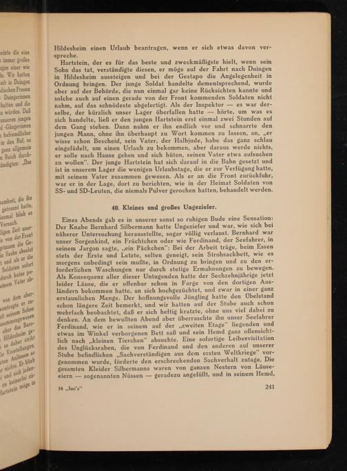 Eines Abends gab es in unserer sonst so ruhigen Bude eine Sensation: N Der Knabe Bernhard Silbermann hatte Ungeziefer und war, wie sich bei näherer Untersuchung herausstellte, sogar völlig verlaust. Bernhard war unser Sorgenkind, ein Früchtchen oder wie Ferdinand, der Seefahrer, in seinem Jargon sagte,„ein Päckchen”: Bei der Arbeit träge, beim Essen stets der Erste und Letzte, selten geneigt, sein Strohsackbett, wie es morgens unbedingt sein mußte, in Ordnung zu bringen und zu den er- forderlichen Waschungen nur durch stetige Ermahnungen zu bewegen. Als Konsequenz aller dieser Untugenden hatte der Sechzehnjährige jetzt leider Läuse, die er offenbar schon in Farge von den dortigen Aus- I ländern bekommen hatte, an sich hochgezüchtet, und zwar in einer ganz| erstaunlichen Menge. Der hoffnungsvolle Jüngling hatte den Übelstand| schon längere Zeit bemerkt, und wir hatten auf der Stube auch schon mehrfach beobachtet, daß er sich heftig kratzte, ohne uns viel dabei zu denken, An dem bewußten Abend aber überraschte ihn unser Seefahrer Ferdinand, wie er in seinem auf der„zweiten Etage” liegenden und etwas im Winkel verborgenen Bett saß und sein Hemd ganz offensicht- lich nach„kleinen Tierchen” absuchte, Eine sofortige Leibesvisitation| des Unglücksraben, die von Ferdinand und den anderen auf unserer Stube befindlichen„Sachverständigen aus dem ersten Weltkriege”