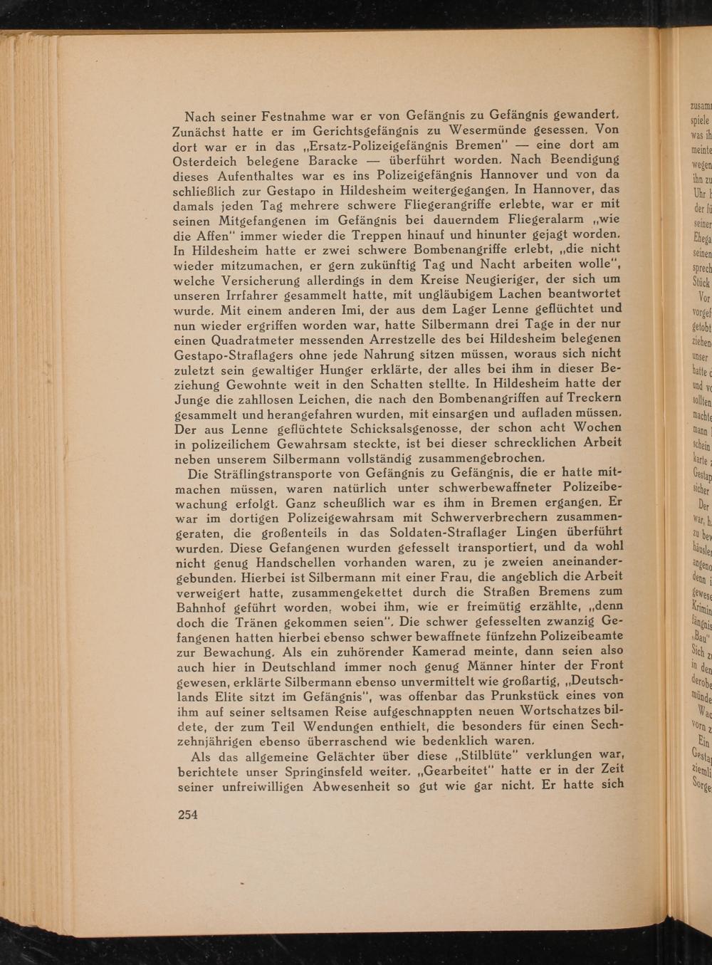 Nach seiner Festnahme war er von Gefängnis zu Gefängnis gewandert. Zunächst hatte er im Gerichtsgefängnis zu Wesermünde gesessen, Von eine dort am dort war er in das ,, Ersatz- Polizeigefängnis Bremen " Osterdeich belegene Baracke überführt worden. Nach Beendigung dieses Aufenthaltes war es ins Polizeigefängnis Hannover und von da schließlich zur Gestapo in Hildesheim weitergegangen. In Hannover , das damals jeden Tag mehrere schwere Fliegerangriffe erlebte, war er mit seinen Mitgefangenen im Gefängnis bei dauerndem Fliegeralarm ,, wie die Affen" immer wieder die Treppen hinauf und hinunter gejagt worden. In Hildesheim hatte er zwei schwere Bombenangriffe erlebt ,,, die nicht wieder mitzumachen, er gern zukünftig Tag und Nacht arbeiten wolle", welche Versicherung allerdings in dem Kreise Neugieriger, der sich um unseren Irrfahrer gesammelt hatte, mit ungläubigem Lachen beantwortet wurde. Mit einem anderen Imi, der aus dem Lager Lenne geflüchtet und nun wieder ergriffen worden war, hatte Silbermann drei Tage in der nur einen Quadratmeter messenden Arrestzelle des bei Hildesheim belegenen Gestapo - Straflagers ohne jede Nahrung sitzen müssen, woraus sich nicht zuletzt sein gewaltiger Hunger erklärte, der alles bei ihm in dieser Beziehung Gewohnte weit in den Schatten stellte. In Hildesheim hatte der Junge die zahllosen Leichen, die nach den Bombenangriffen auf Treckern gesammelt und herangefahren wurden, mit einsargen und aufladen müssen. Der aus Lenne geflüchtete Schicksalsgenosse, der schon acht Wochen in polizeilichem Gewahrsam steckte, ist bei dieser schrecklichen Arbeit neben unserem Silbermann vollständig zusammengebrochen.