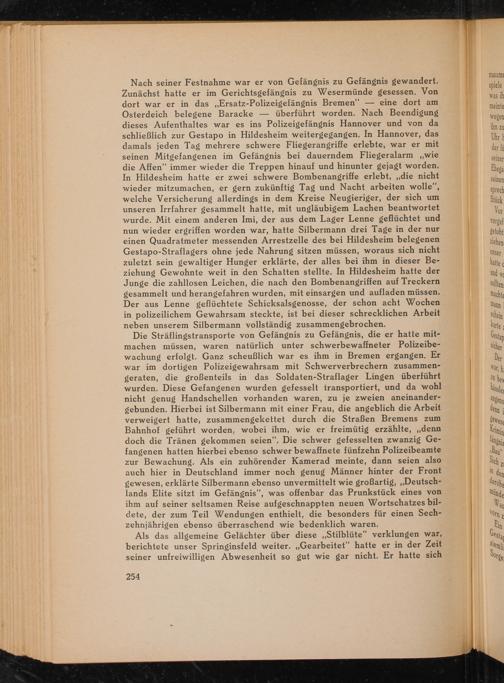 Die Sträflingstransporte von Gefängnis zu Gefängnis, die er hatte mitmachen müssen, waren natürlich unter schwerbewaffneter Polizeibewachung erfolgt. Ganz scheußlich war es ihm in Bremen ergangen, Er war im dortigen Polizeigewahrsam mit Schwerverbrechern zusammengeraten, die großenteils in das Soldaten- Straflager Lingen überführt wurden. Diese Gefangenen wurden gefesselt transportiert, und da wohl nicht genug Handschellen vorhanden waren, zu je zweien aneinandergebunden. Hierbei ist Silbermann mit einer Frau, die angeblich die Arbeit verweigert hatte, zusammengekettet durch die Straßen Bremens zum Bahnhof geführt worden, wobei ihm, wie er freimütig erzählte ,,, denn doch die Tränen gekommen seien". Die schwer gefesselten zwanzig Gefangenen hatten hierbei ebenso schwer bewaffnete fünfzehn Polizeibeamte zur Bewachung. Als ein zuhörender Kamerad meinte, dann seien also auch hier in Deutschland immer noch genug Männer hinter der Front gewesen, erklärte Silbermann ebenso unvermittelt wie großartig ,,, Deutschlands Elite sitzt im Gefängnis", was offenbar das Prunkstück eines von ihm auf seiner seltsamen Reise aufgeschnappten neuen Wortschatzes bildete, der zum Teil Wendungen enthielt, die besonders für einen Sechzehnjährigen ebenso überraschend wie bedenklich waren.