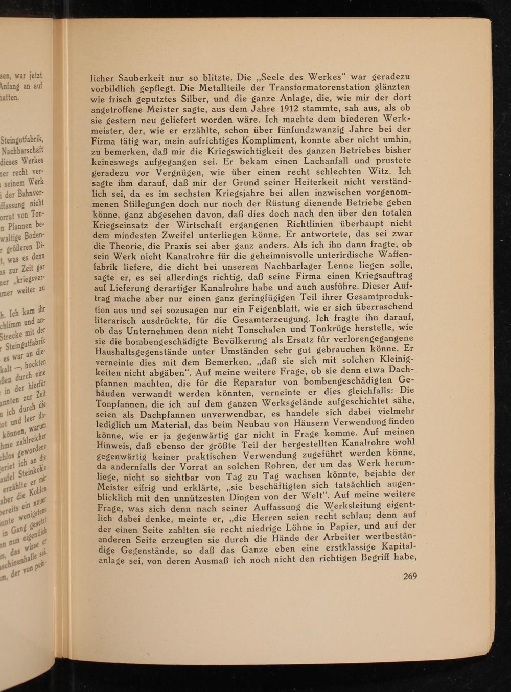 licher Sauberkeit nur so blitzte, Die„Seele des Werkes” war geradezu vorbildlich gepflegt. Die Metallteile der Transformatorenstation glänzten wie frisch geputztes Silber, und die ganze Anlage, die, wie mir der dort angetroffene Meister sagte, aus dem Jahre 1912 stammte, sah aus, als ob sie gestern neu geliefert worden wäre. Ich machte dem biederen Werk- meister, der, wie er erzählte, schon über fünfundzwanzig Jahre bei der Firma tätig war, mein aufrichtiges Kompliment, konnte aber nicht umhin, zu bemerken, daß mir die Kriegswichtigkeit des ganzen Betriebes bisher keineswegs aufgegangen sei, Er bekam einen Lachanfall und prustete geradezu vor Vergnügen, wie über einen recht schlechten Witz, Ich sagte ihm darauf, daß mir der Grund seiner Heiterkeit nicht verständ- lich sei, da es im sechsten Kriegsjahre bei allen inzwischen vorgenom- menen Stillesungen doch nur noch der Rüstung dienende Betriebe geben könne, ganz abgesehen davon, daß dies doch nach den über den totalen Kriegseinsatz der Wirtschaft ergangenen Richtlinien überhaupt nicht dem mindesten Zweifel unterliegen könne. Er antwortete, das sei zwar die Theorie, die Praxis sei aber ganz anders. Als ich ihn dann fragte, ob sein Werk nicht Kanalrohre für die geheimnisvolle unterirdische Waffen- fabrik liefere, die dicht bei unserem Nachbarlager Lenne liegen solle, sagte er, es sei allerdings richtig, daß seine Firma einen Kriegsauftrag aul Lieferung derartiger Kanalrohre habe und auch ausführe, Dieser Auf- trag mache aber nur einen ganz geringfügigen Teil ihrer Gesamtproduk- tion aus und sei sozusagen nur ein Feigenblatt, wie er sich überraschend literarisch ausdrückte, für die Gesamterzeugung. Ich fragte ihn darauf, ob das Unternehmen denn nicht Tonschalen und Tonkrüge herstelle, wie sie die bombengeschädigte Bevölkerung als Ersatz für verlorengegangene Haushaltsgegenstände unter Umständen sehr gut gebrauchen könne, Er verneinte dies mit dem Bemerken,„daß sie sich mit solchen Kleinig- keiten nicht abgäben“, Auf meine weitere Frage, ob sie denn etwa Dach- pfannen machten, die für die Reparatur von bombengeschädigten Ge- bäuden verwandt werden könnten, verneinte er dies gleichfalls: Die Tonpfannen, die ich auf dem ganzen Werksgelände aufgeschichtet sähe, seien als Dachpfannen unverwendbar, es handele sich dabei vielmehr lediglich um Material, das beim Neubau von Häusern Verwendung finden könne, wie er ja gegenwärtig gar nicht in Frage komme, Auf meinen Hinweis, daß ebenso der größte Teil der hergestellten Kanalrohre wohl gegenwärtig keiner praktischen Verwendung zugeführt werden könne, da andernfalls der Vorrat an solchen Rohren, der um das Werk herum- liege, nicht so sichtbar von Tag zu Tag wachsen könnte, bejahte der Meister eifrig und erklärte,„sie beschäftigten sich tatsächlich augen- blicklich mit den unnützesten Dingen von der Welt“, Auf meine weitere Frage, was sich denn nach seiner Auffassung die Werksleitung eigent- lich dabei denke, meinte er,„die Herren seien recht schlau; denn auf der einen Seite zahlten sie recht niedrige Löhne in Papier, und auf der anderen Seite erzeugten sie durch die Hände der Arbeiter wertbestän- dige Gegenstände, so daß das Ganze eben eine erstklassige Kapital- anlage sei, von deren Ausmaß ich noch nicht den richtigen Begriff habe,