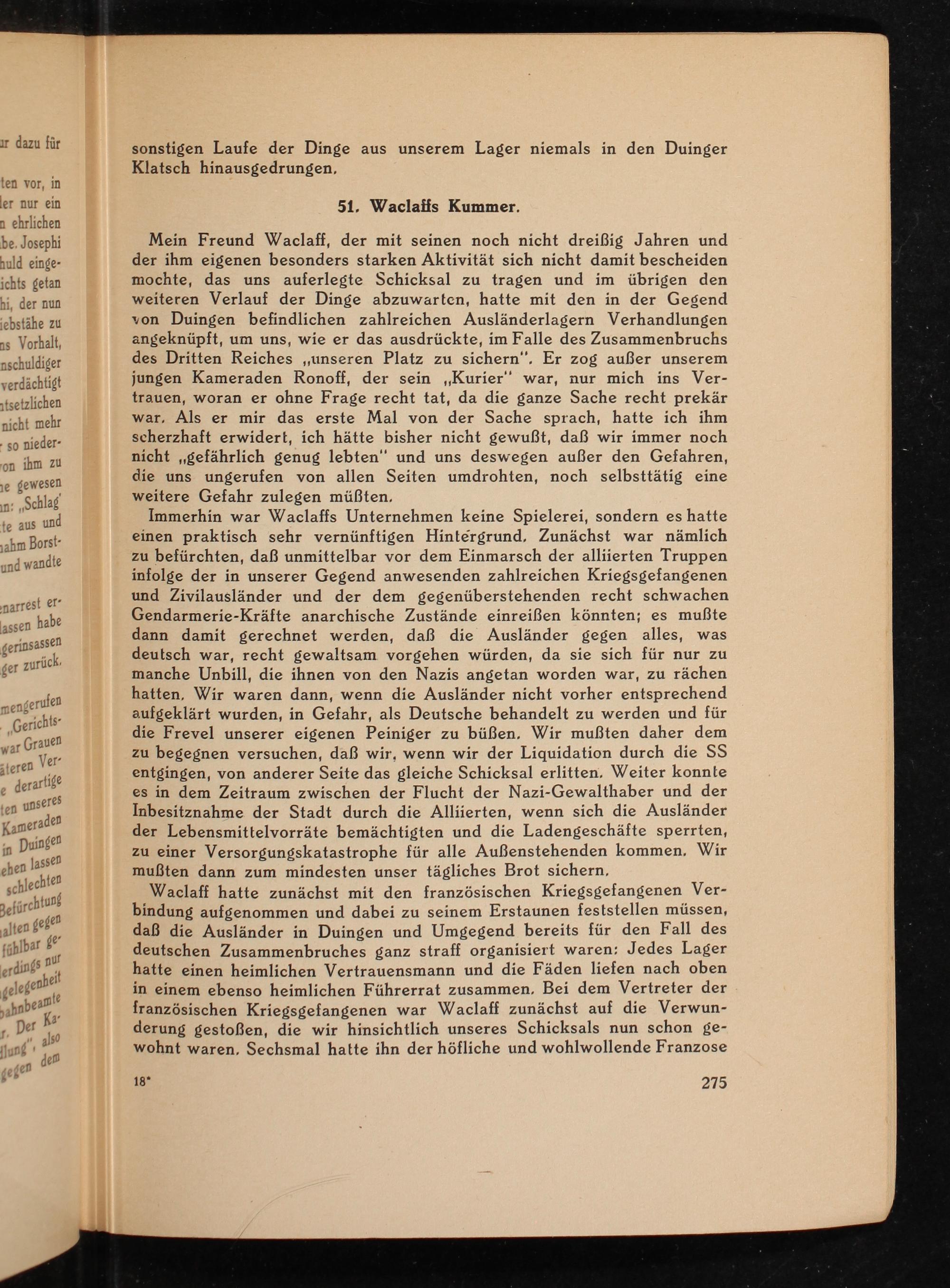 Waclaff hatte zunächst mit den französischen Kriegsgefangenen Verbindung aufgenommen und dabei zu seinem Erstaunen feststellen müssen, daß die Ausländer in Duingen und Umgegend bereits für den Fall des deutschen Zusammenbruches ganz straff organisiert waren: Jedes Lager hatte einen heimlichen Vertrauensmann und die Fäden liefen nach oben in einem ebenso heimlichen Führerrat zusammen. Bei dem Vertreter der französischen Kriegsgefangenen war Waclaff zunächst auf die Verwunderung gestoßen, die wir hinsichtlich unseres Schicksals nun schon gewohnt waren. Sechsmal hatte ihn der höfliche und wohlwollende Franzose