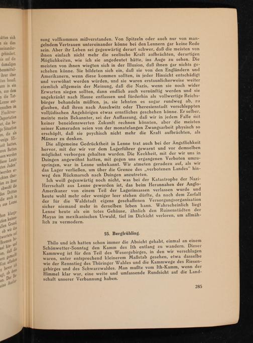 sung vollkommen mißverstanden. Von Spitzeln oder auch nur von man- gelndem Vertrauen untereinander könne bei den Lennern gar keine Rede sein. Aber ihr Leben sei gegenwärtig derart schwer, daß die meisten von ihnen einfach nicht mehr die seelische Kraft aufbrächten, derartigen Möglichkeiten, wie ich sie angedeutet hätte, ins Auge zu sehen. Die meisten von ihnen wiegten sich in der Illusion, daß ihnen gar nichts ge- schehen könne, Sie bildeten sich ein, daß sie von den Engländern und Amerikanern, wenn diese kommen sollten, in jeder Hinsicht entschädigt und verwöhnt werden würden, und sie waren erstaunlicherweise weiter ziemlich allgemein der Meinung, daß die Nazis, wenn sie noch wider Erwarten siegen sollten, dann endlich auch vernünftig werden und sie ungekränkt nach Hause entlassen und fürderhin als vollwertige Reichs- bürger behandeln müßten, ja, sie lehnten es sogar rundweg ab, zu glauben, daß ihren nach Auschwitz oder Theresienstadt verschleppten volljüdischen Angehörigen etwas ernstliches geschehen könne. Er selber, meinte mein Bekannter, sei der Auffassung, daß wir in jedem Falle mit keiner beneidenswerten Zukunft rechnen könnten, aber die meisten seiner Kameraden seien von der monatelangen Zwangsarbeit physisch so erschöpft, daß sie psychisch nicht mehr die Kraft aufbrächten, als Männer zu denken,