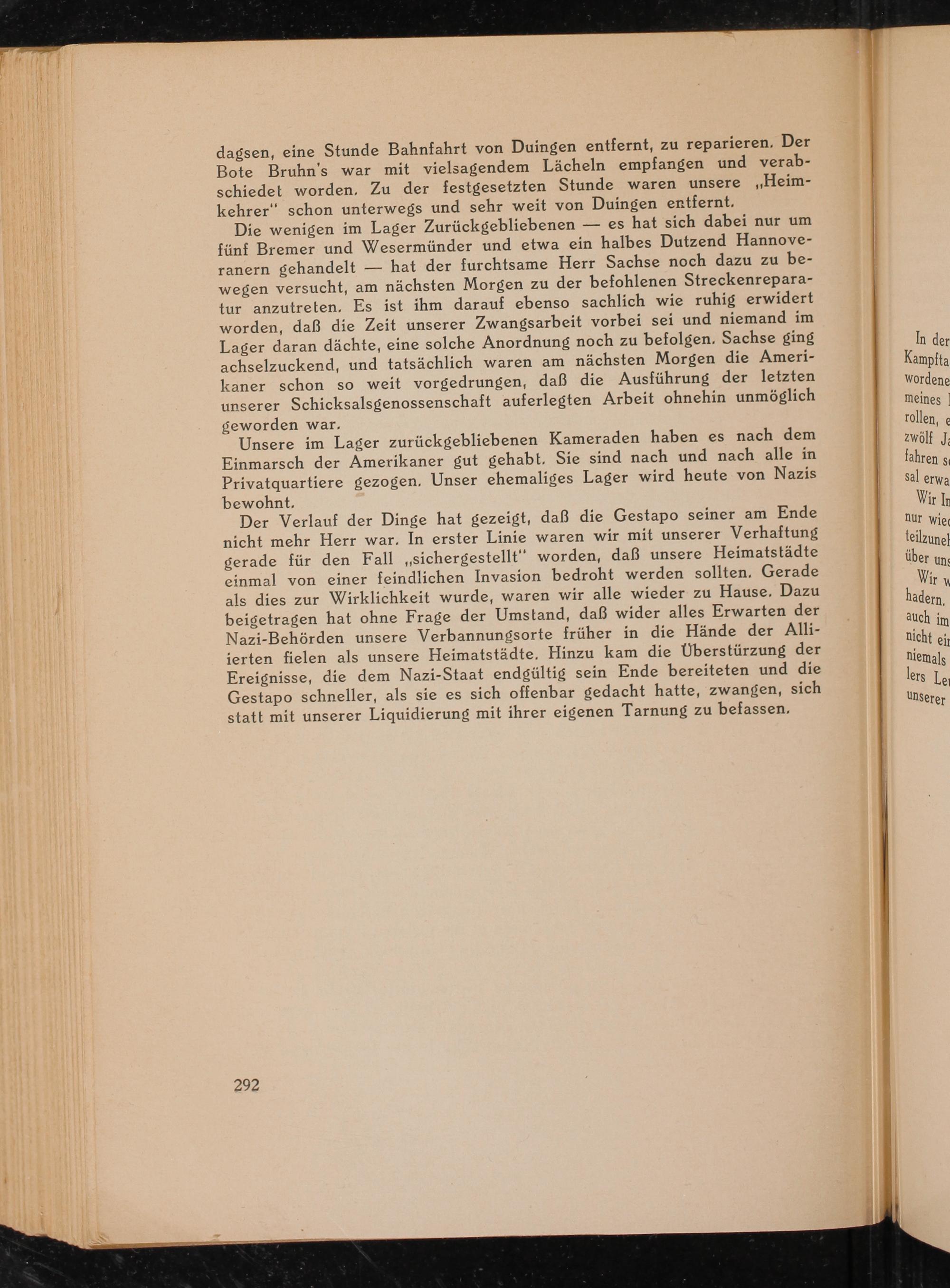 Der Verlauf der Dinge hat gezeigt, daß die Gestapo seiner am Ende nicht mehr Herr war. In erster Linie waren wir mit unserer Verhaftung gerade für den Fall ,, sichergestellt" worden, daß unsere Heimatstädte einmal von einer feindlichen Invasion bedroht werden sollten. Gerade als dies zur Wirklichkeit wurde, waren wir alle wieder zu Hause. Dazu beigetragen hat ohne Frage der Umstand, daß wider alles Erwarten der Nazi- Behörden unsere Verbannungsorte früher in die Hände der Alliierten fielen als unsere Heimatstädte. Hinzu kam die Überstürzung der Ereignisse, die dem Nazi- Staat endgültig sein Ende bereiteten und die Gestapo schneller, als sie es sich offenbar gedacht hatte, zwangen, sich statt mit unserer Liquidierung mit ihrer eigenen Tarnung zu befassen.