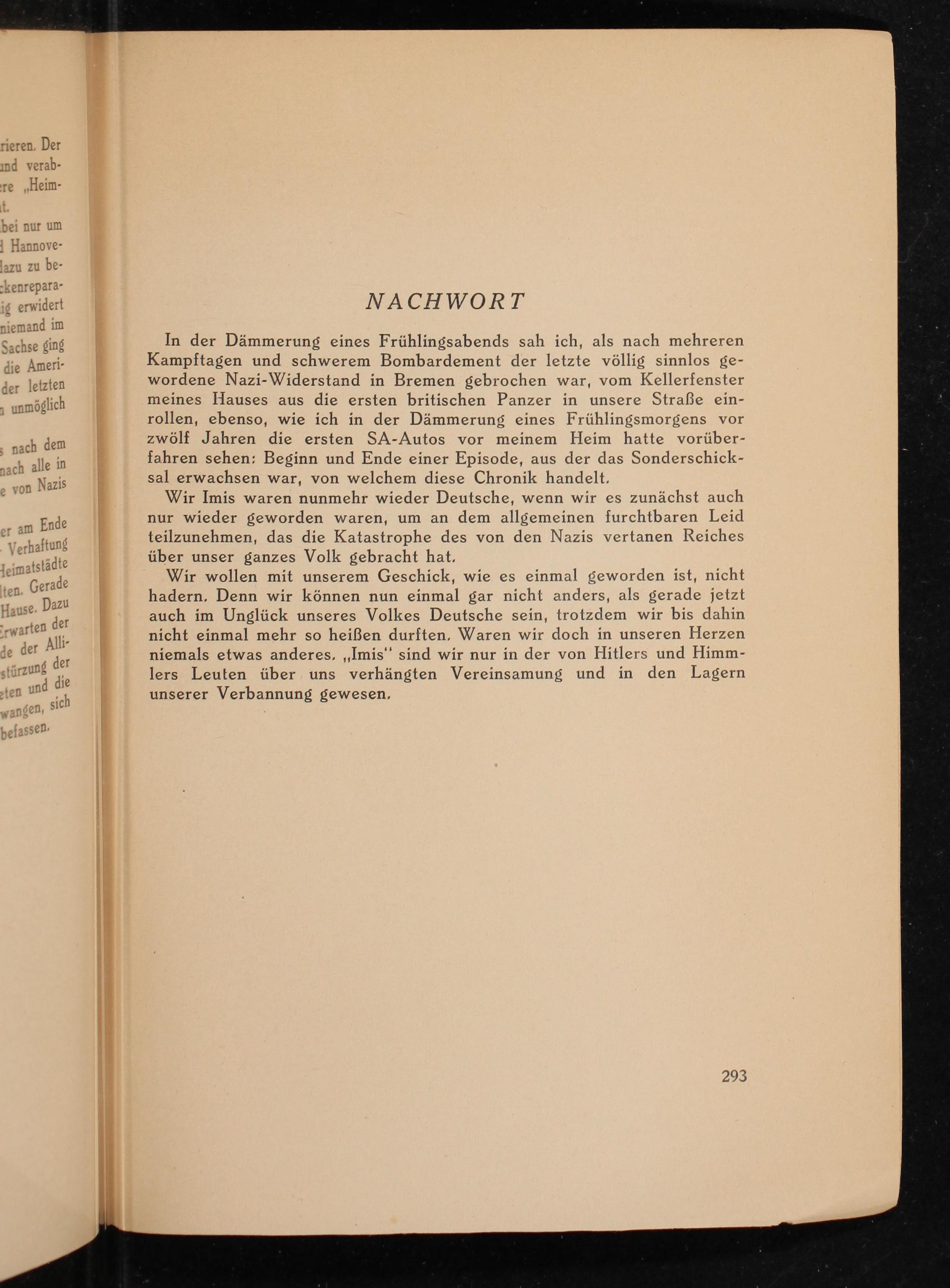 Wir Imis waren nunmehr wieder Deutsche, wenn wir es zunächst auch nur wieder geworden waren, um an dem allgemeinen furchtbaren Leid teilzunehmen, das die Katastrophe des von den Nazis vertanen Reiches über unser ganzes Volk gebracht hat.