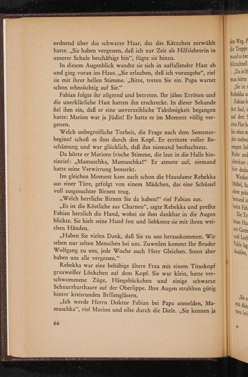 Fabian folgte ihr zögernd und betreten. Ihr jähes Erröten und die unerklärliche Hast hatten ihn erschreckt. In dieser Sekunde fiel ihm ein, daß er eine unverzeihliche Taktlosigkeit begangen hatte: Marion war ja Jüdin! Er hatte es im Moment völlig ver