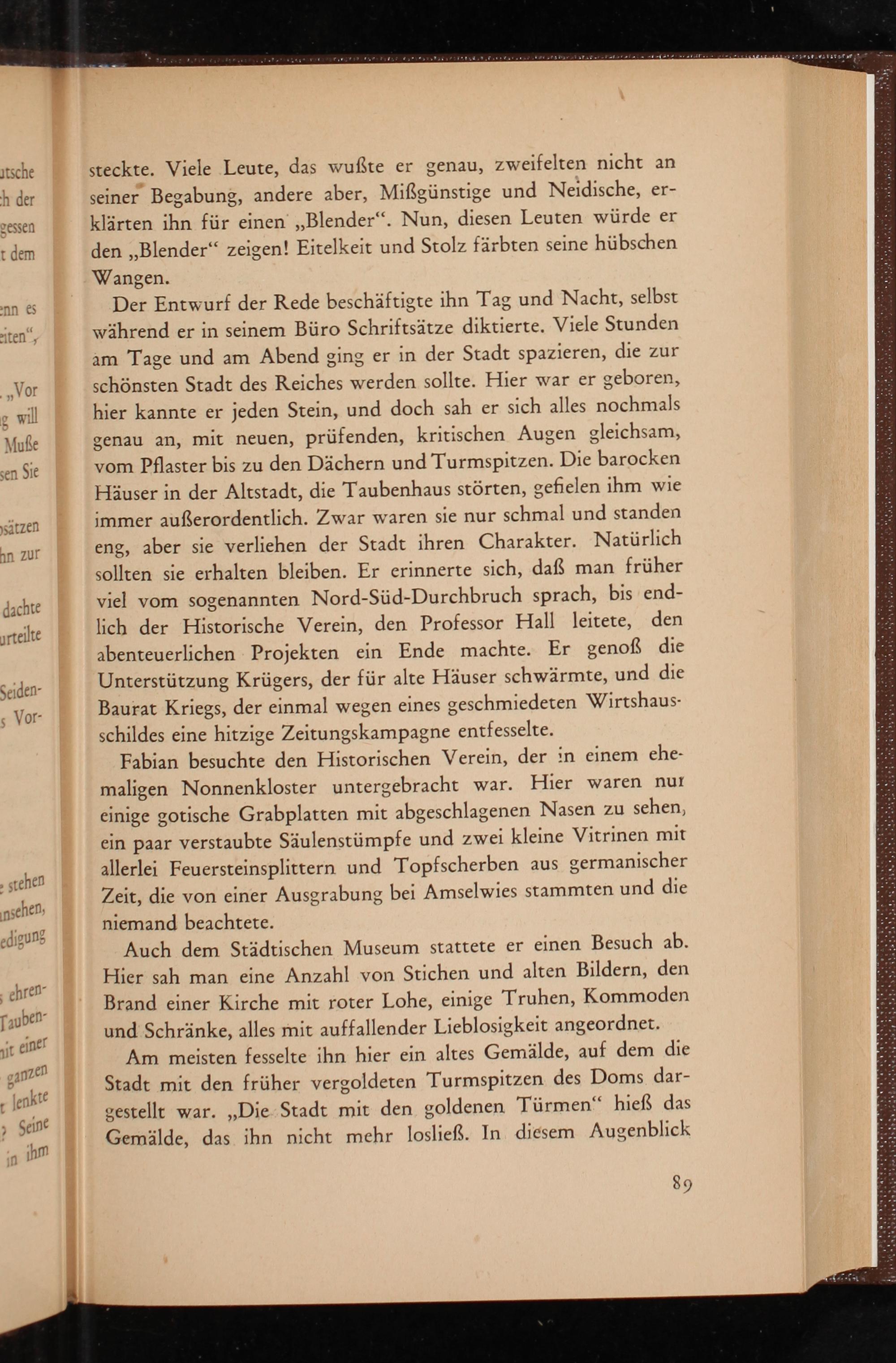 Der Entwurf der Rede beschäftigte ihn Tag und Nacht, selbst während er in seinem Büro Schriftsätze diktierte. Viele Stunden am Tage und am Abend ging er in der Stadt spazieren, die zur schönsten Stadt des Reiches werden sollte. Hier war er geboren, hier kannte er jeden Stein, und doch sah er sich alles nochmals genau an, mit neuen, prüfenden, kritischen Augen gleichsam, vom Pflaster bis zu den Dächern und Turmspitzen. Die barocken Häuser in der Altstadt, die Taubenhaus störten, gefielen ihm wie immer außerordentlich. Zwar waren sie nur schmal und standen eng, aber sie verliehen der Stadt ihren Charakter. Natürlich sollten sie erhalten bleiben. Er erinnerte sich, daß man früher viel vom sogenannten Nord- Süd- Durchbruch sprach, bis endlich der Historische Verein, den Professor Hall leitete, den abenteuerlichen Projekten ein Ende machte. Er genoß die Unterstützung Krügers, der für alte Häuser schwärmte, und die Baurat Kriegs, der einmal wegen eines geschmiedeten Wirtshausschildes eine hitzige Zeitungskampagne entfesselte.