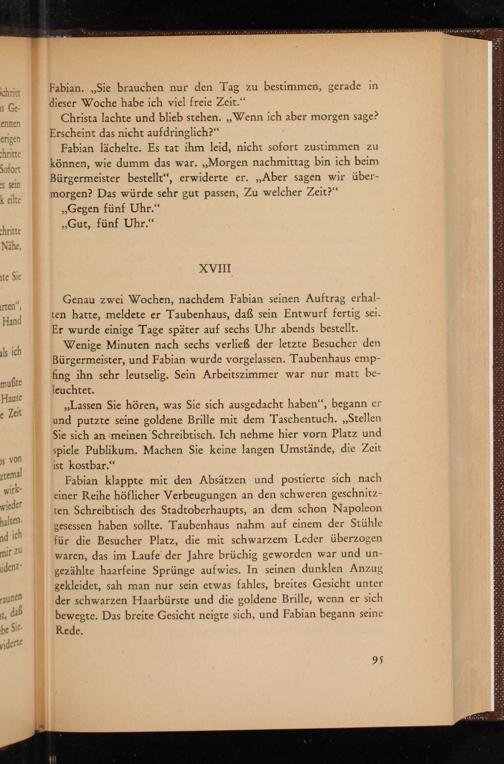 Genau zwei Wochen, nachdem Fabian seinen Auftrag erhalten hatte, meldete er Taubenhaus, daß sein Entwurf fertig sei. Er wurde einige Tage später auf sechs Uhr abends bestellt.