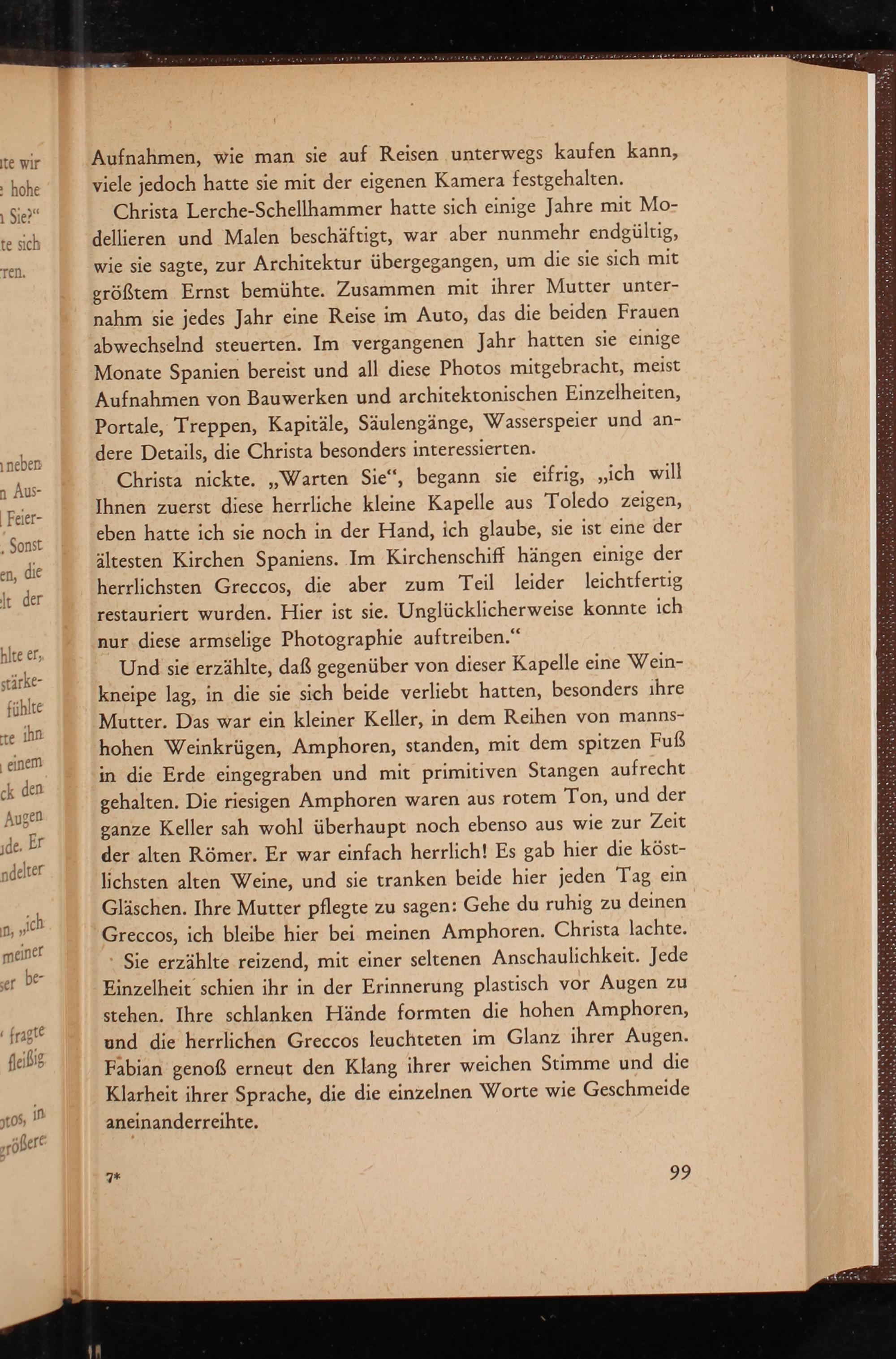 Christa Lerche- Schellhammer hatte sich einige Jahre mit Modellieren und Malen beschäftigt, war aber nunmehr endgültig, wie sie sagte, zur Architektur übergegangen, um die sie sich mit größtem Ernst bemühte. Zusammen mit ihrer Mutter unternahm sie jedes Jahr eine Reise im Auto, das die beiden Frauen abwechselnd steuerten. Im vergangenen Jahr hatten sie einige Monate Spanien bereist und all diese Photos mitgebracht, meist Aufnahmen von Bauwerken und architektonischen Einzelheiten, Portale, Treppen, Kapitäle, Säulengänge, Wasserspeier und andere Details, die Christa besonders interessierten.