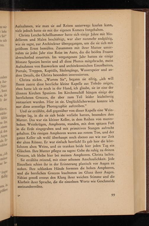 Und sie erzählte, daß gegenüber von dieser Kapelle eine Weinkneipe lag, in die sie sich beide verliebt hatten, besonders ihre Mutter. Das war ein kleiner Keller, in dem Reihen von mannshohen Weinkrügen, Amphoren, standen, mit dem spitzen Fuß in die Erde eingegraben und mit primitiven Stangen aufrecht gehalten. Die riesigen Amphoren waren aus rotem Ton, und der ganze Keller sah wohl überhaupt noch ebenso aus wie zur Zeit der alten Römer. Er war einfach herrlich! Es gab hier die köstlichsten alten Weine, und sie tranken beide hier jeden Tag ein Gläschen. Ihre Mutter pflegte zu sagen: Gehe du ruhig zu deinen Greccos, ich bleibe hier bei meinen Amphoren. Christa lachte. Sie erzählte reizend, mit einer seltenen Anschaulichkeit. Jede Einzelheit schien ihr in der Erinnerung plastisch vor Augen zu stehen. Ihre schlanken Hände formten die hohen Amphoren, und die herrlichen Greccos leuchteten im Glanz ihrer Augen. Fabian genoß erneut den Klang ihrer weichen Stimme und die Klarheit ihrer Sprache, die die einzelnen Worte wie Geschmeide aneinanderreihte.