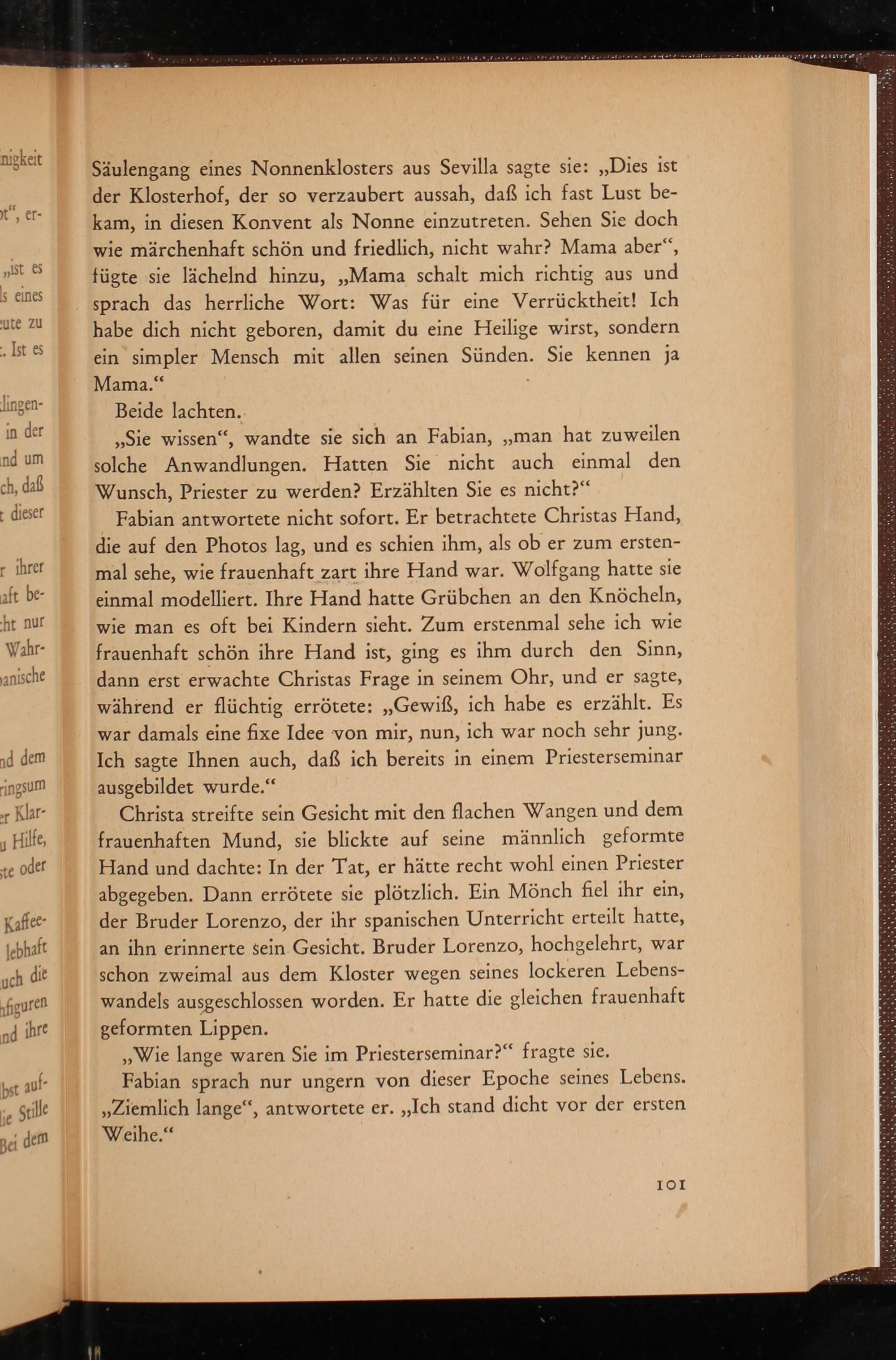 solche Anwandlungen. Hatten Sie nicht auch einmal den Wunsch, Priester zu werden? Erzählten Sie es nicht?“ Fabian antwortete nicht sofort. Er betrachtete Christas Hand, die auf den Photos lag, und es schien ihm, als ob er zum ersten- mal sehe, wie frauenhaft zart ihre Hand war. Wolfgang hatte sie einmal modelliert. Ihre Hand hatte Grübchen an den Knöcheln, wie man es oft bei Kindern sieht. Zum erstenmal sche ich wie frauenhaft schön ihre Hand ist, ging es ihm durch den Sinn, dann erst erwachte Christas Frage in seinem Ohr, und er sagte, während er flüchtig errötete:„Gewiß, ich habe es erzählt. Es war damals eine fixe Idee von mir, nun, ich war noch sehr jung. Ich sagte Ihnen auch, daß ich bereits in einem Priesterseminar ausgebildet wurde.“