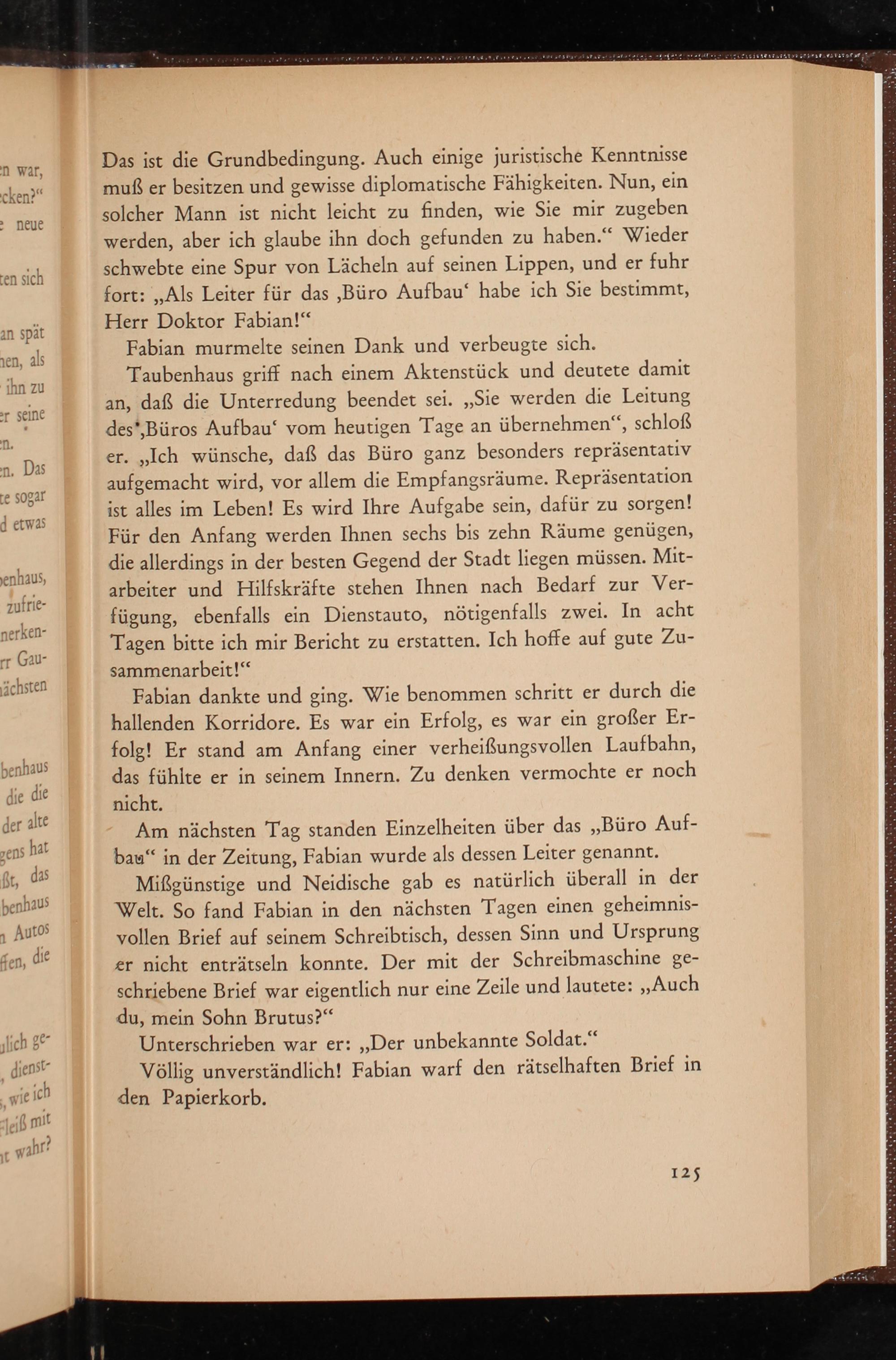 Mißgünstige und Neidische gab es natürlich überall in der Welt. So fand Fabian in den nächsten Tagen einen geheimnisvollen Brief auf seinem Schreibtisch, dessen Sinn und Ursprung er nicht enträtseln konnte. Der mit der Schreibmaschine geschriebene Brief war eigentlich nur eine Zeile und lautete: ,, Auch du, mein Sohn Brutus?"
