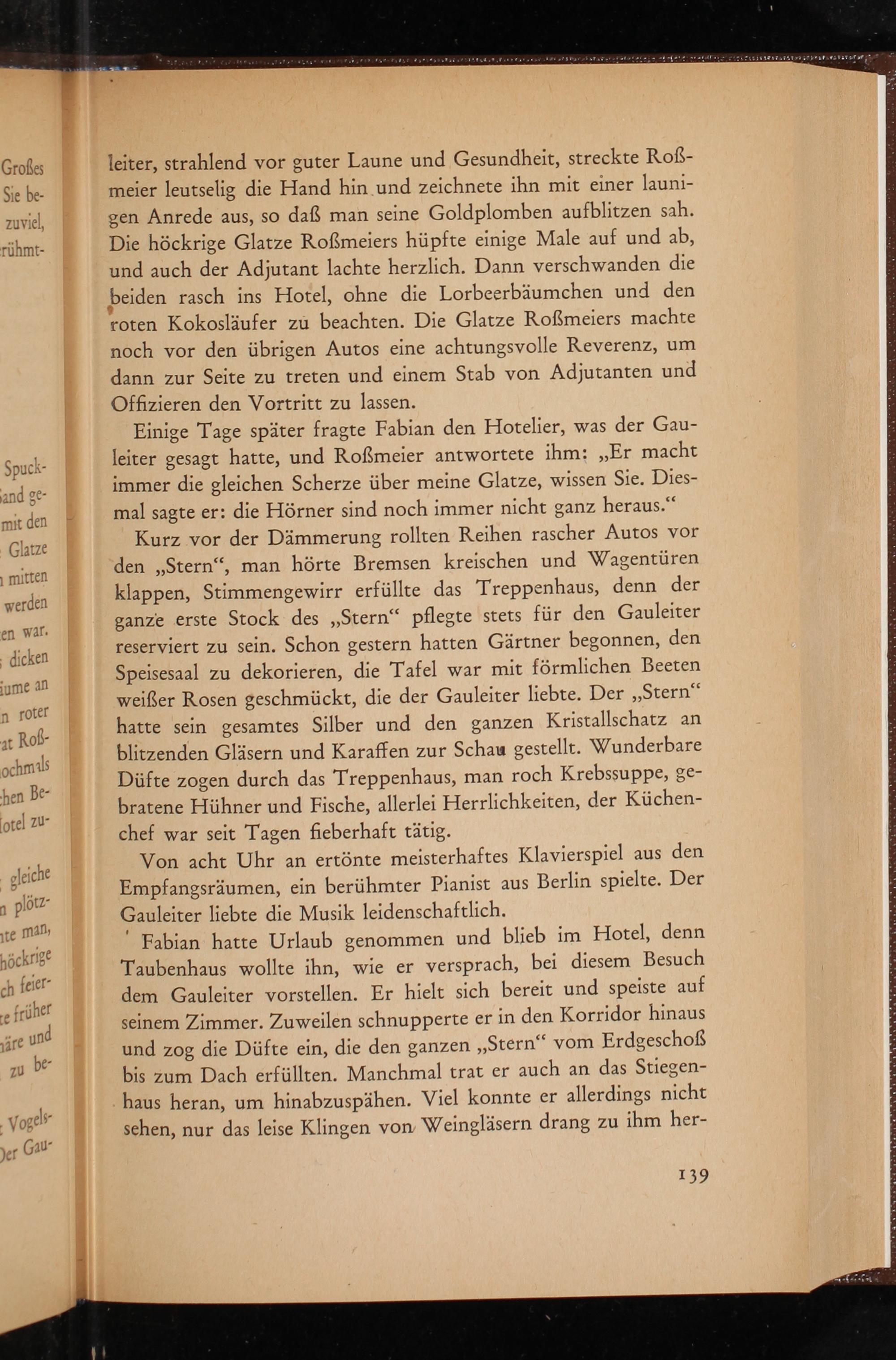 “ Fabian hatte Urlaub genommen und blieb im Hotel, denn Taubenhaus wollte ihn, wie er versprach, bei diesem Besuch dem Gauleiter vorstellen. Er hielt sich bereit und speiste auf seinem Zimmer. Zuweilen schnupperte er in den Korridor hinaus und zog die Düfte ein, die den ganzen„Stern“ vom Erdgeschoß bis zum Dach erfüllten. Manchmal trat er auch an das Stiegen-
